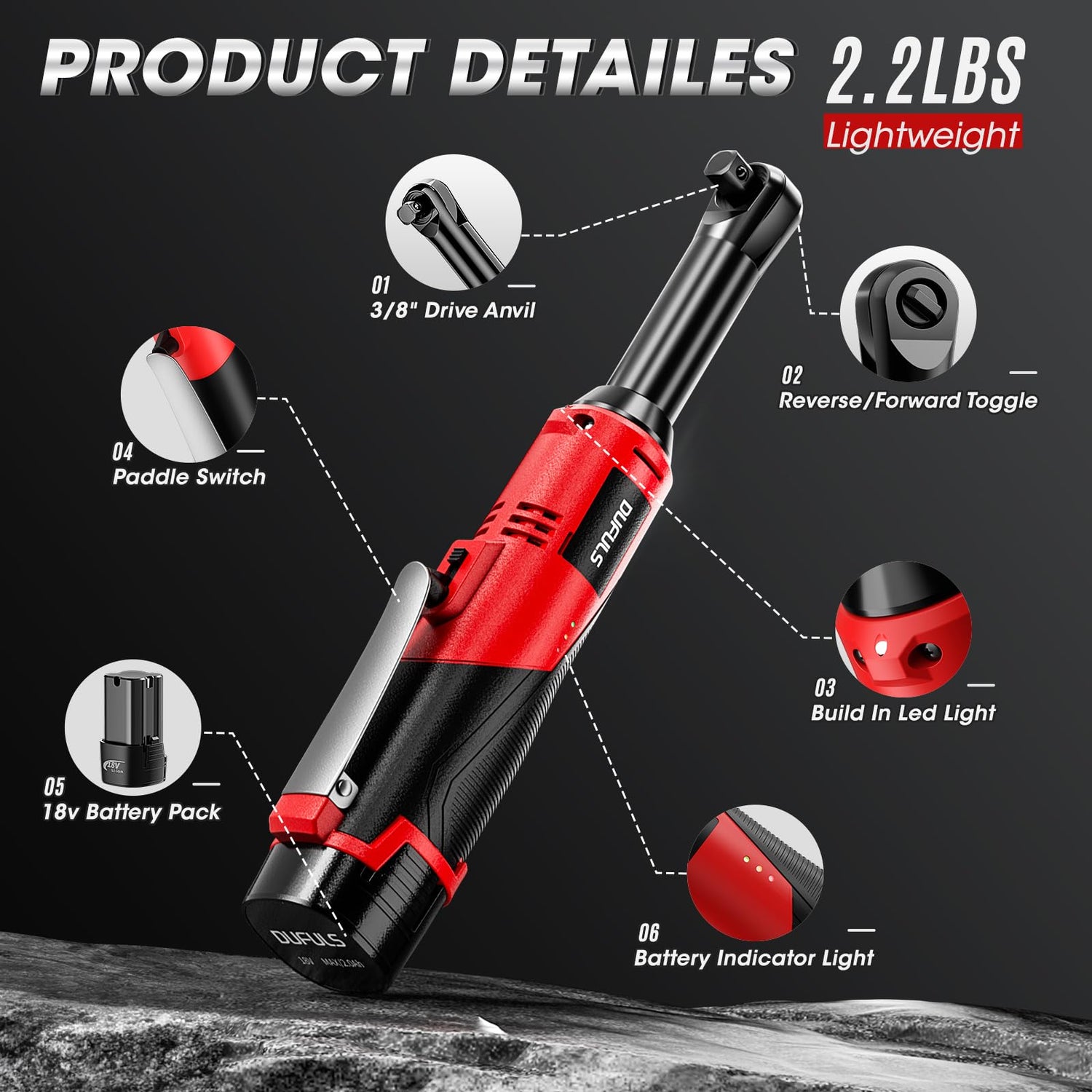 - ✔️✔️【Package Included& Service】The Versatile feature of this rechargeable ratchet makes it a must-have tool for any DIY enthusiast or professional mechanice. Includes 1* battery ratchet wrench, 1* carrying case, 1* charger, 2*2000mAh batteries, 1*1/4" adapter, 7* sockets. If you have any questions about the product, please contact us and Dufuls will provide you with the best service.
