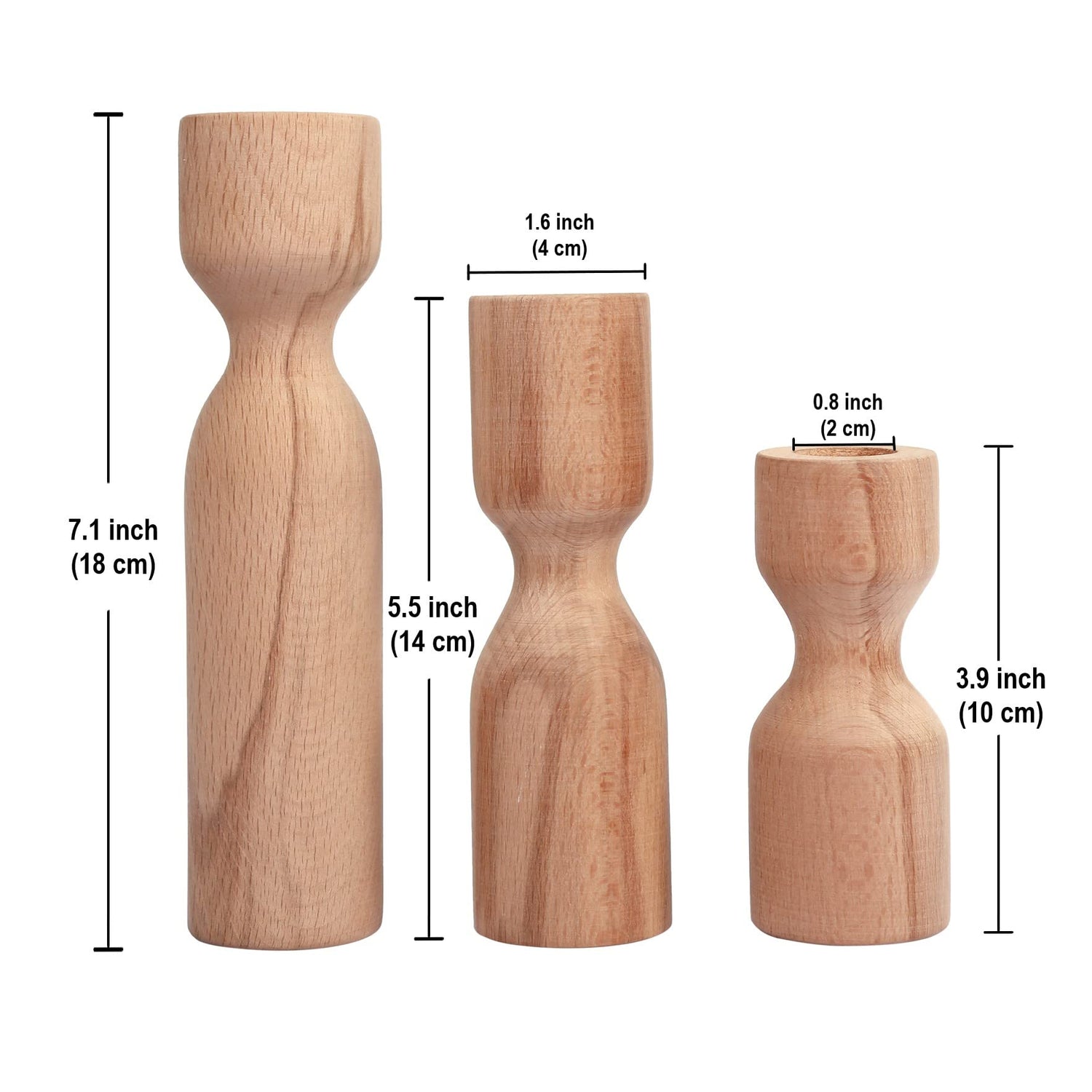 - DIMENSIONS: 3.9 inch(10 cm)-5.5 inch(14 cm)-7.1 inch(18 cm) long wooden candlesticks set will add a stylish look to your home. Our wooden candlesticks made of hornbeam are suitable for candles with a diameter of 0.8 inch (2 cm).