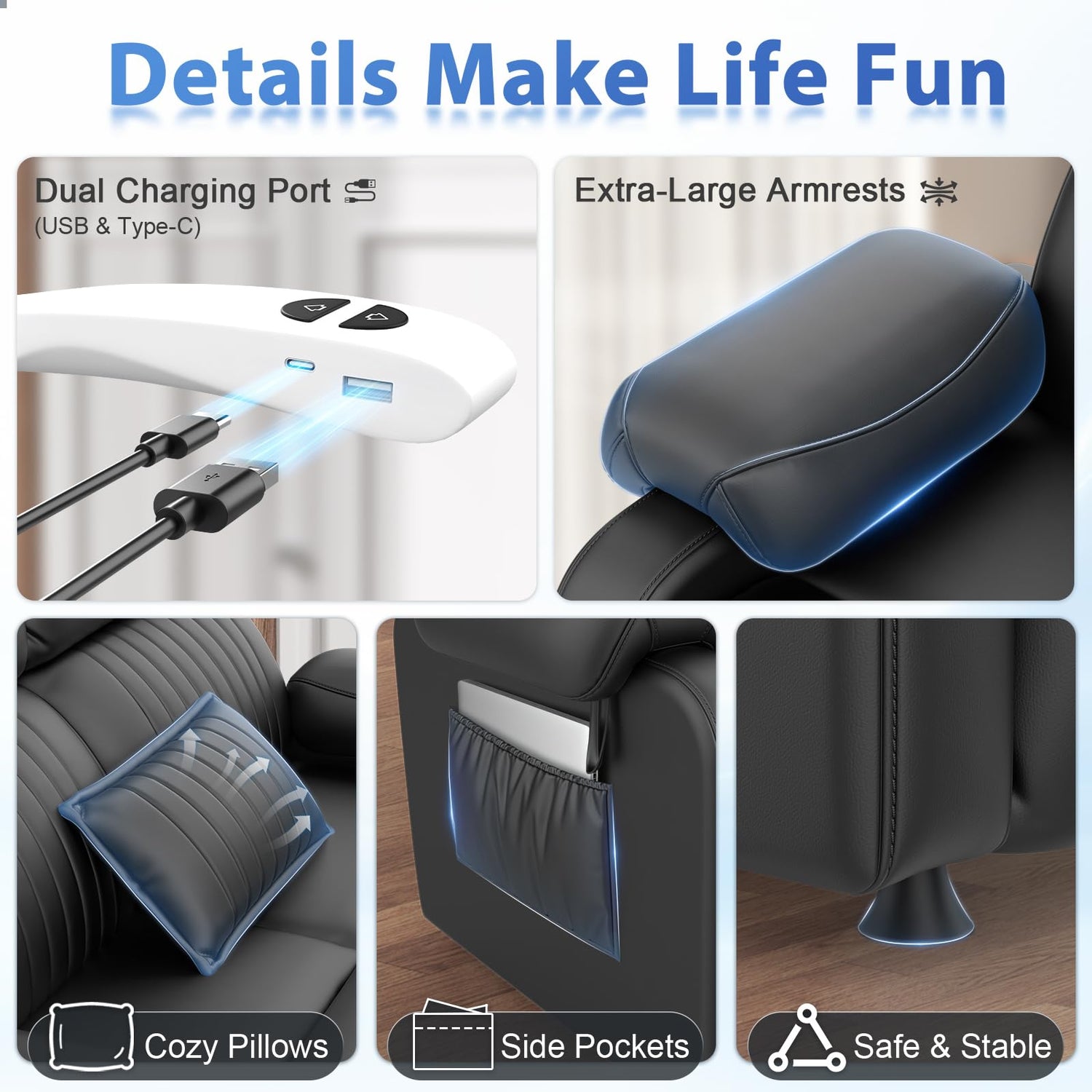 - 【Comes with Two Cozy Pillows】Includes 2 soft matching pillows to complete your double recliner loveseat. Use them as lumbar or headrest support while enjoying your black leather loveseat recliner in your living room or RV