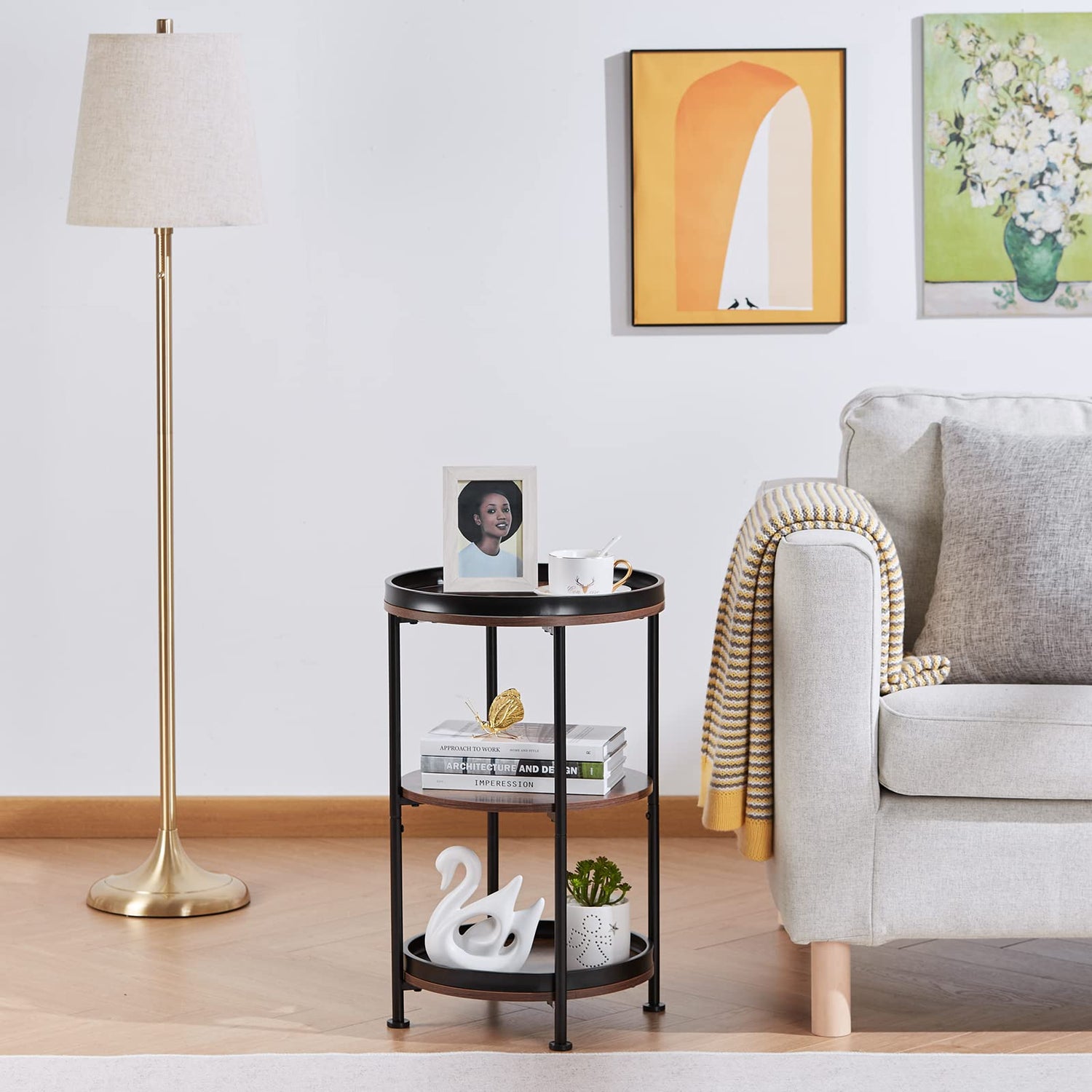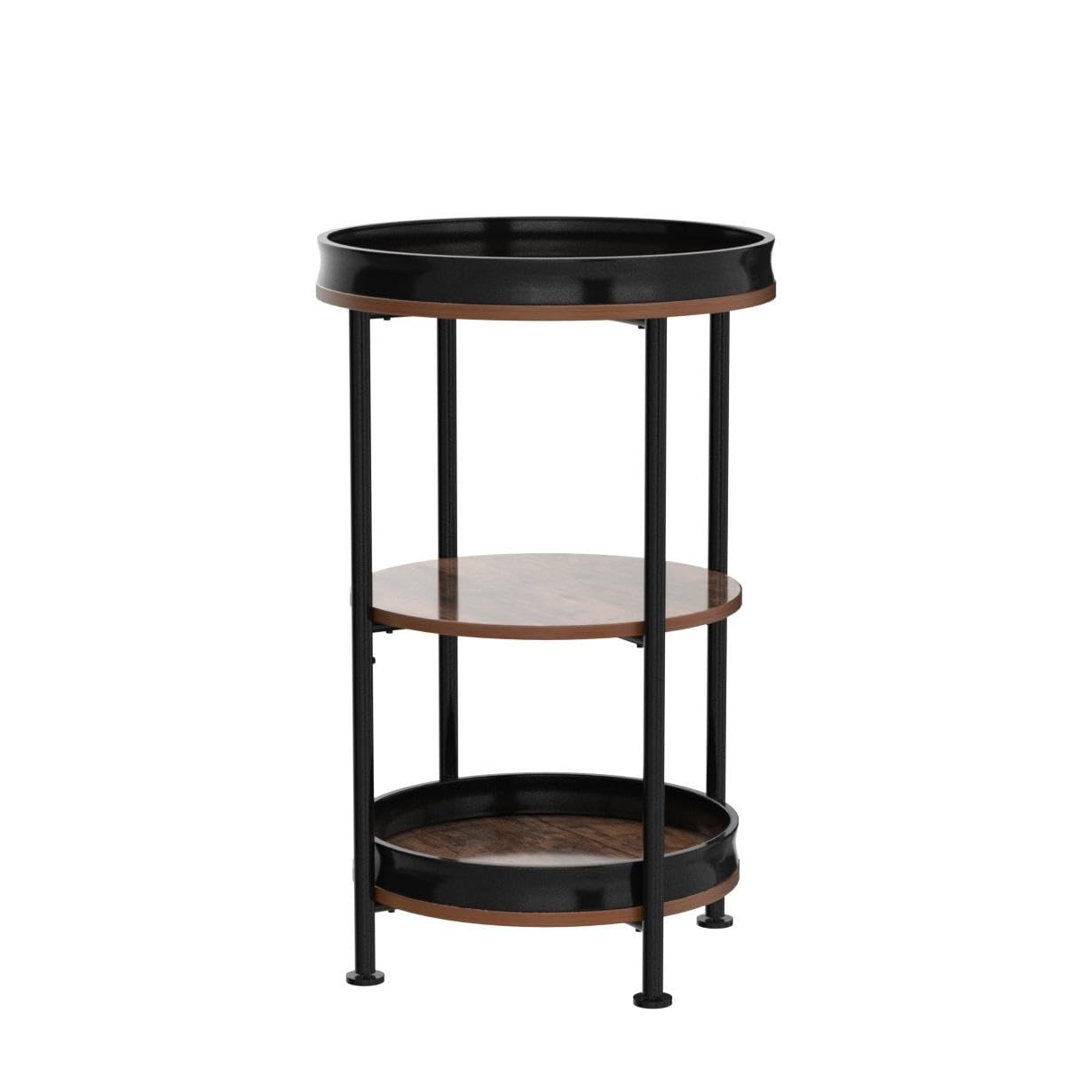 - 【ROUND TABLE】Round Side Table Dimensions: 24'' H × 15'' L × 15'' W. Round shape end table will protect your knees from bruises accidentally caused by sharp corners and create a safer environment for children and your pets to some extent. The industrial look of the black iron frame is complemented by the 3 tiers rustic wood-like desktop of the side tables, the lovingly designed vintage style exudes a touch of classic flair