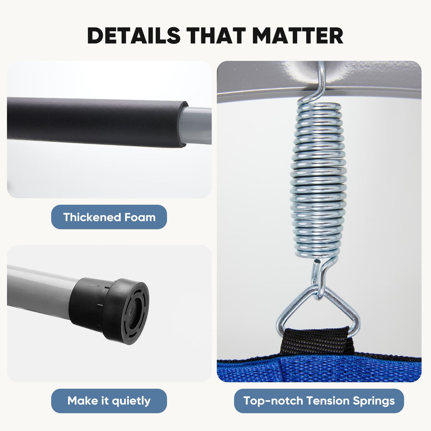 - Adjustable Bar: Rebounder trampoline comes with adjustable height handles. The handles also come with a non-slip material that prevents slipping or falling during use, increasing the safety of the trampoline. The trampoline with adjustable bar allows you to enjoy the fun of bouncing on the trampoline with more peace of mind, and at the same time effectively protects your own safety