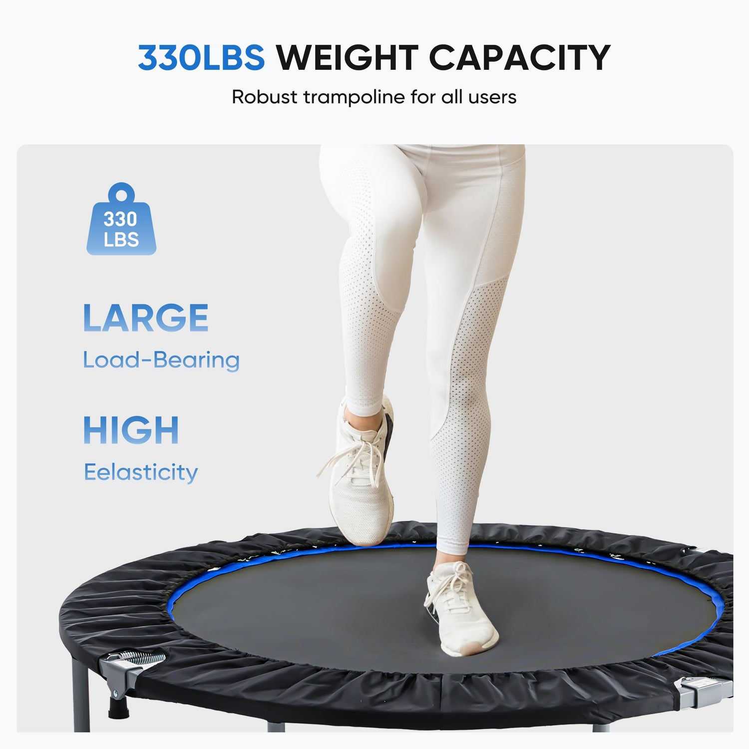 - Trampoline Safety: High-quality steel springs ensure adequate support and rebound force during jumping, reducing the impact on joints and lowering the risk of injury. Mini trampoline adopts a closed design to avoid sharp parts being exposed, safe and not hurting your feet. Fitness trampoline has been rigorously tested and quality inspected, and the weight capacity reaches the standard of 330lbs, so that you can use and enjoy jumping with no worries