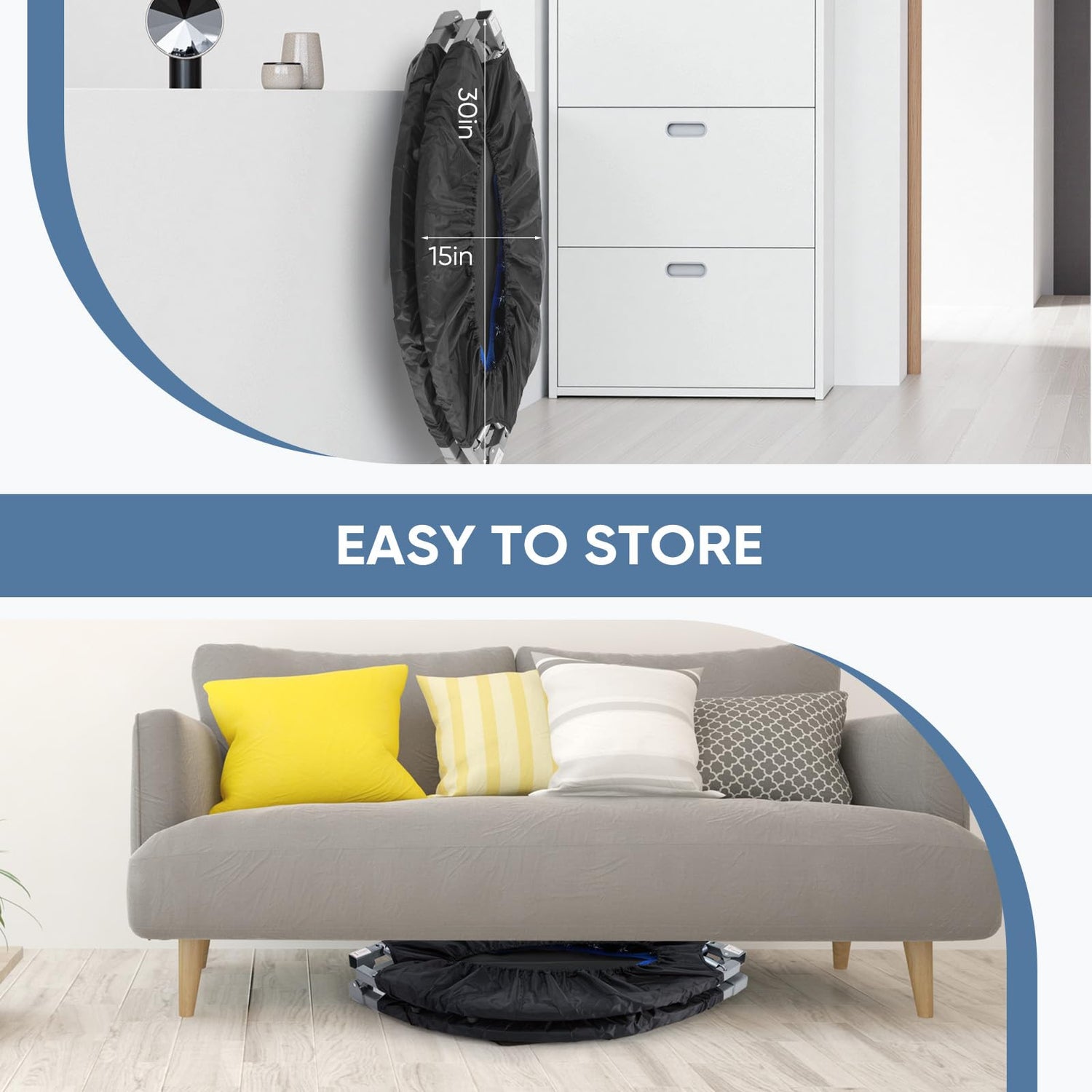 - Fitness Trampoline: Mini fitness trampoline has a sturdy metal frame and highly elastic springs to provide a comfortable bouncing experience. You can do aerobic exercise on the indoor fitness trampoline, jumping for 10 minutes is equivalent to jogging for 1 hour, in order to achieve the fitness effect of exercising cardio function and burning fat
