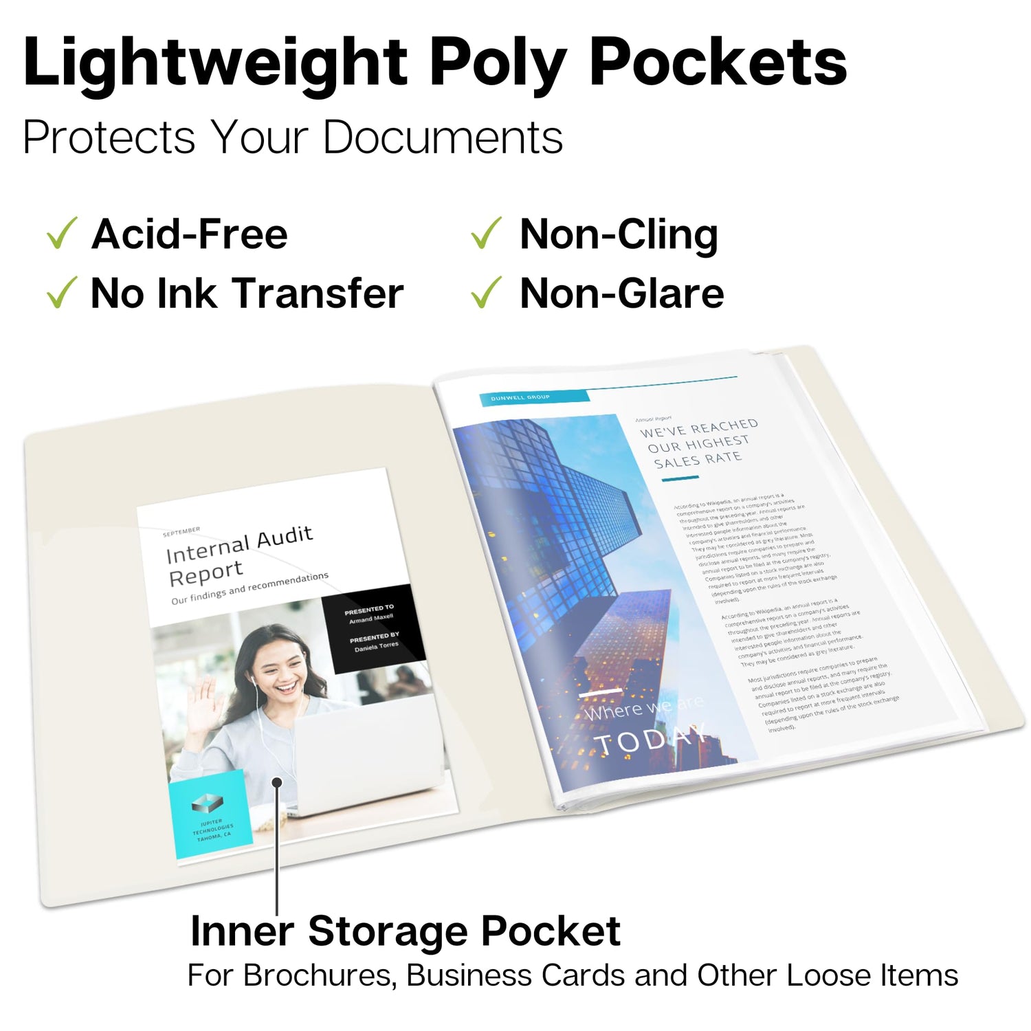 • Premium Quality: Lightweight yet durable sheet pockets are non-glare, no transfer, no ink lift-off, moisture resistant, easy to clean. Portfolio presentation book with front inner pocket for papers.