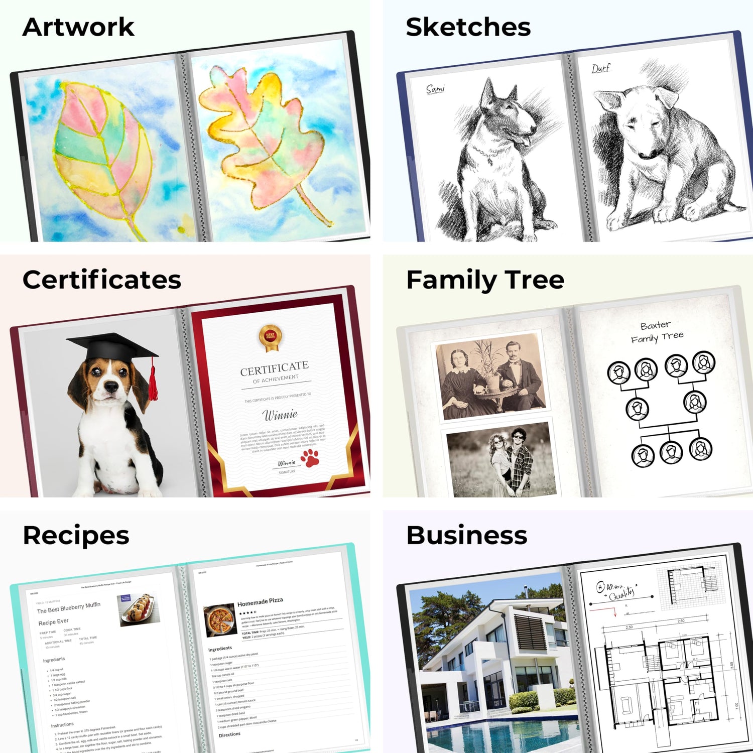 • Many Uses: Document binder, document organizer for diplomas, birth certificates, family tree, photo binder, stencils, art portfolio, awards, modeling portfolio book, art display book, office binder.