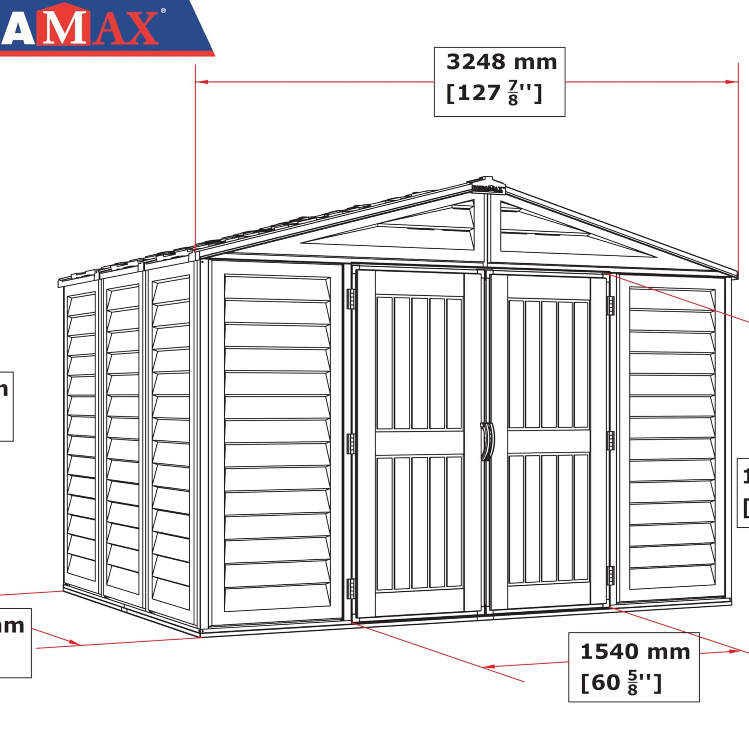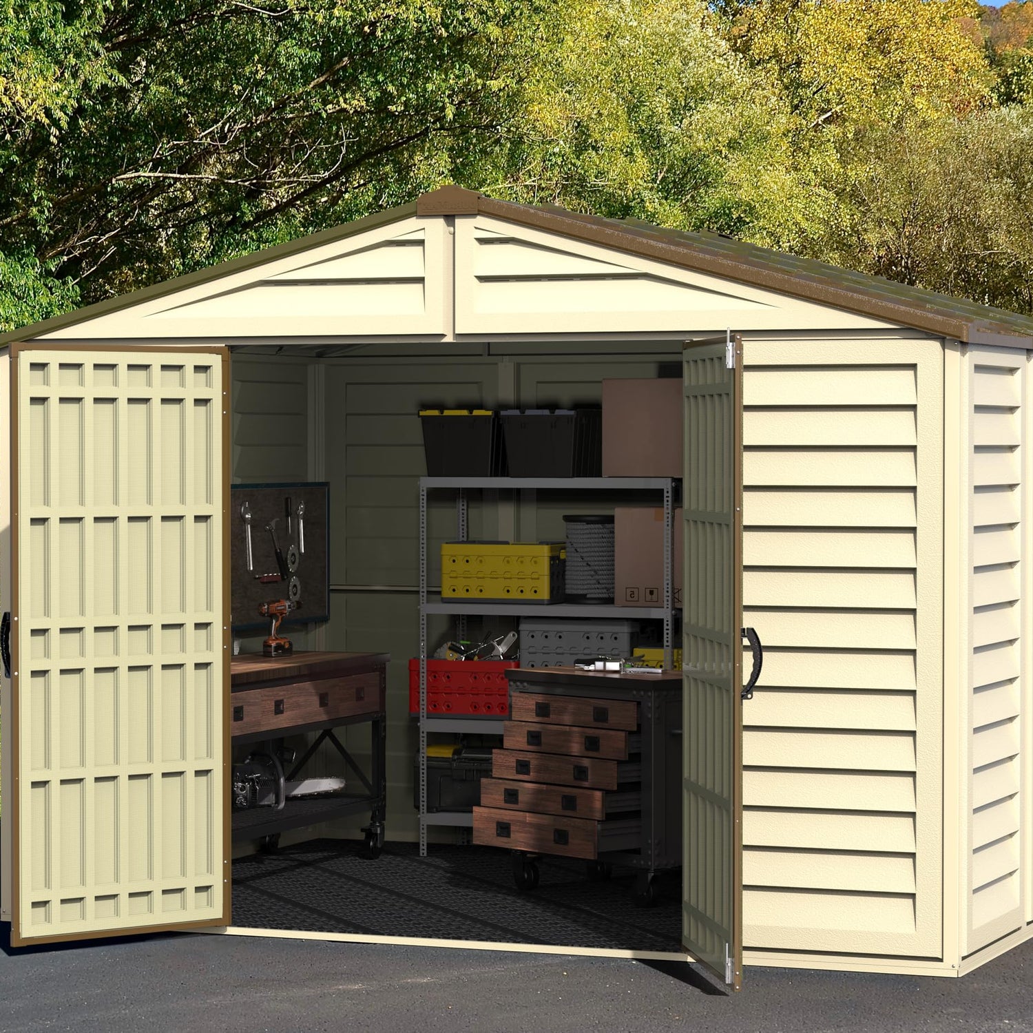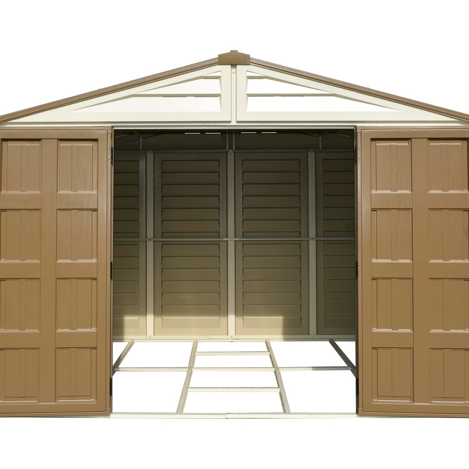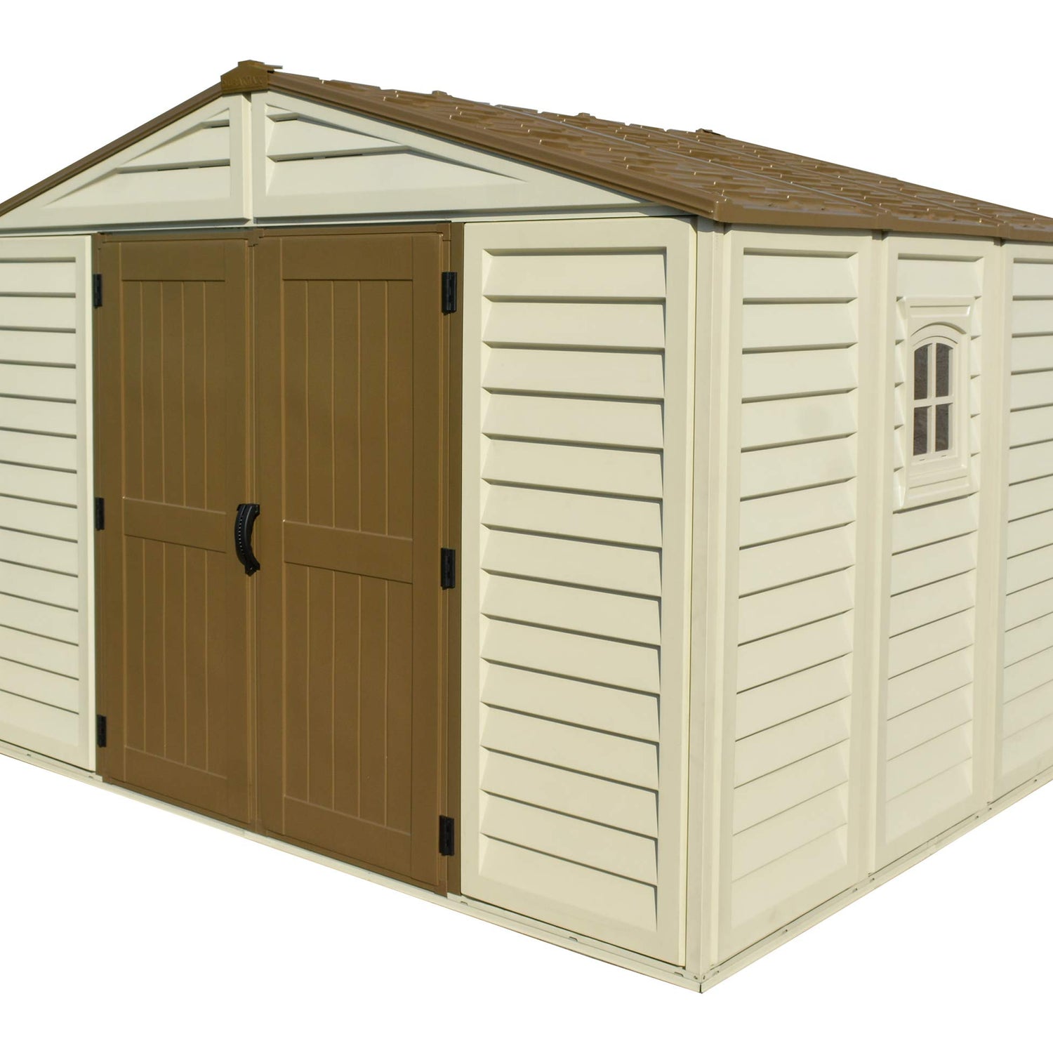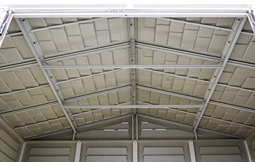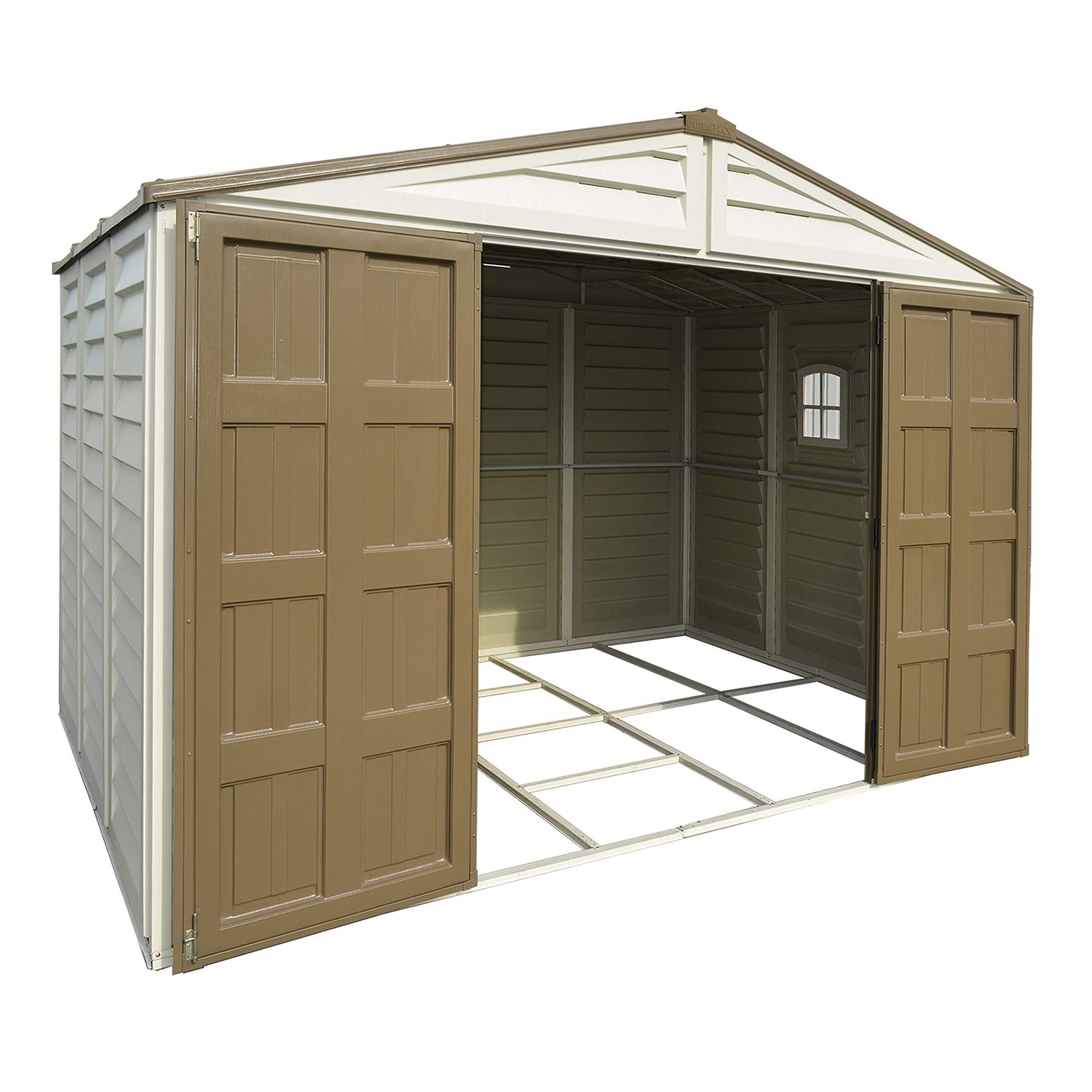 Duramax Woodbridge Plus 10.5 x 8 (8.02 m2) Plastic Garden Shed with 1 Fixed Window & Metal Foundation Kit, Strong Metal Roof Structure Fire Retardant and Maintenance-Free Storage Shed - Ivory/Brown