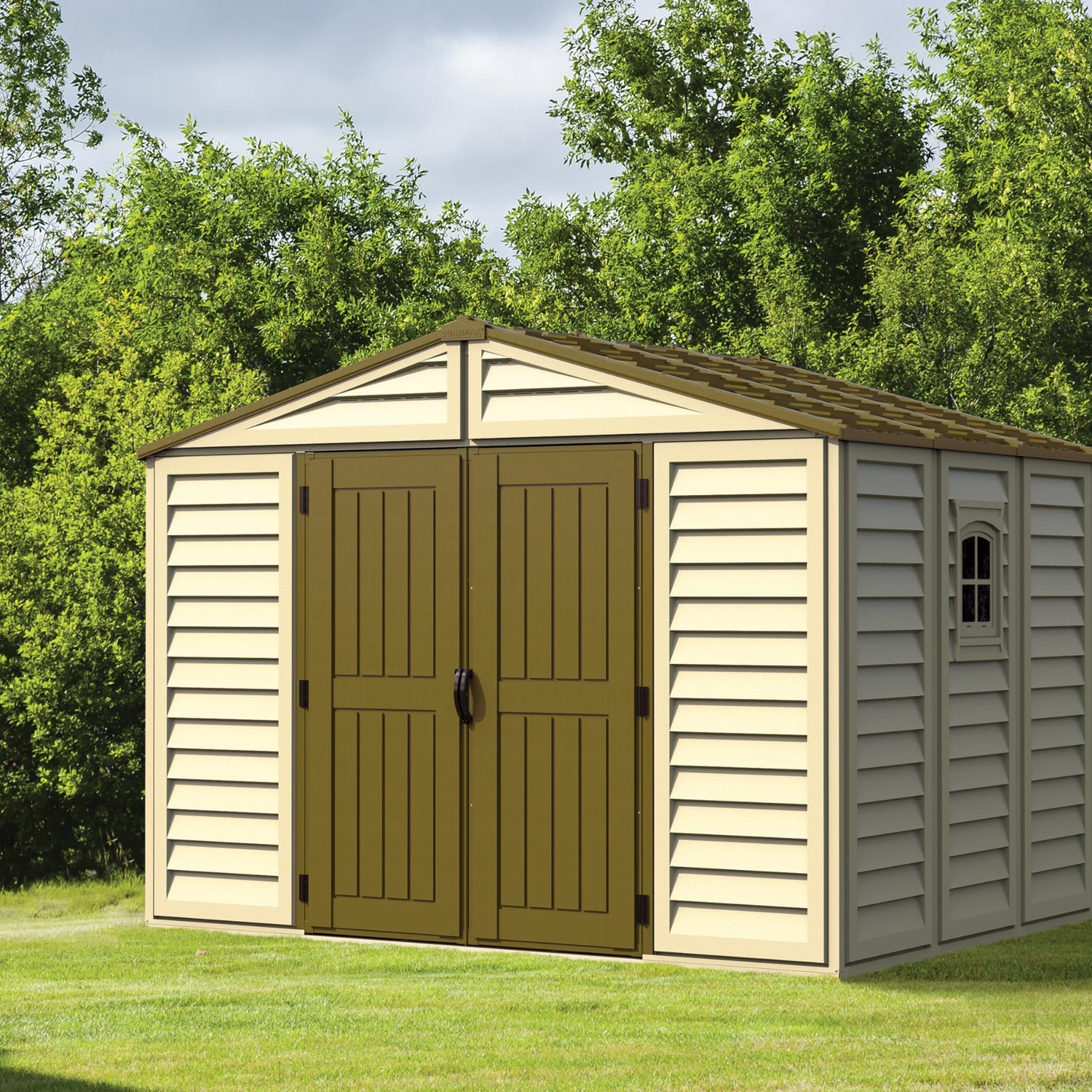 Details: The WoodBridge Plus 10.5 x 8 vinyl shed adds elegance to any outdoor setting. With a generous 8 s.q m., it has the ideal size to keep your gardening tools, bikes, BBQ, exercise equipment, auto repair accessories, and other belongings dry and secure. The wall panels are made from durable, long lasting and easy to maintain vinyl that will not rust, rot or dent and unlike other plastics sheds in the market, this PVC garden shed is also fire retardant. This tall walk-in shed features tall and wide double doors for easy storage, includes metal foundation kit and 1 fixed window. The roof is reinforced with a solid metal structure and during winter it can hold up to 20 lbs/ sq. ft. of snow