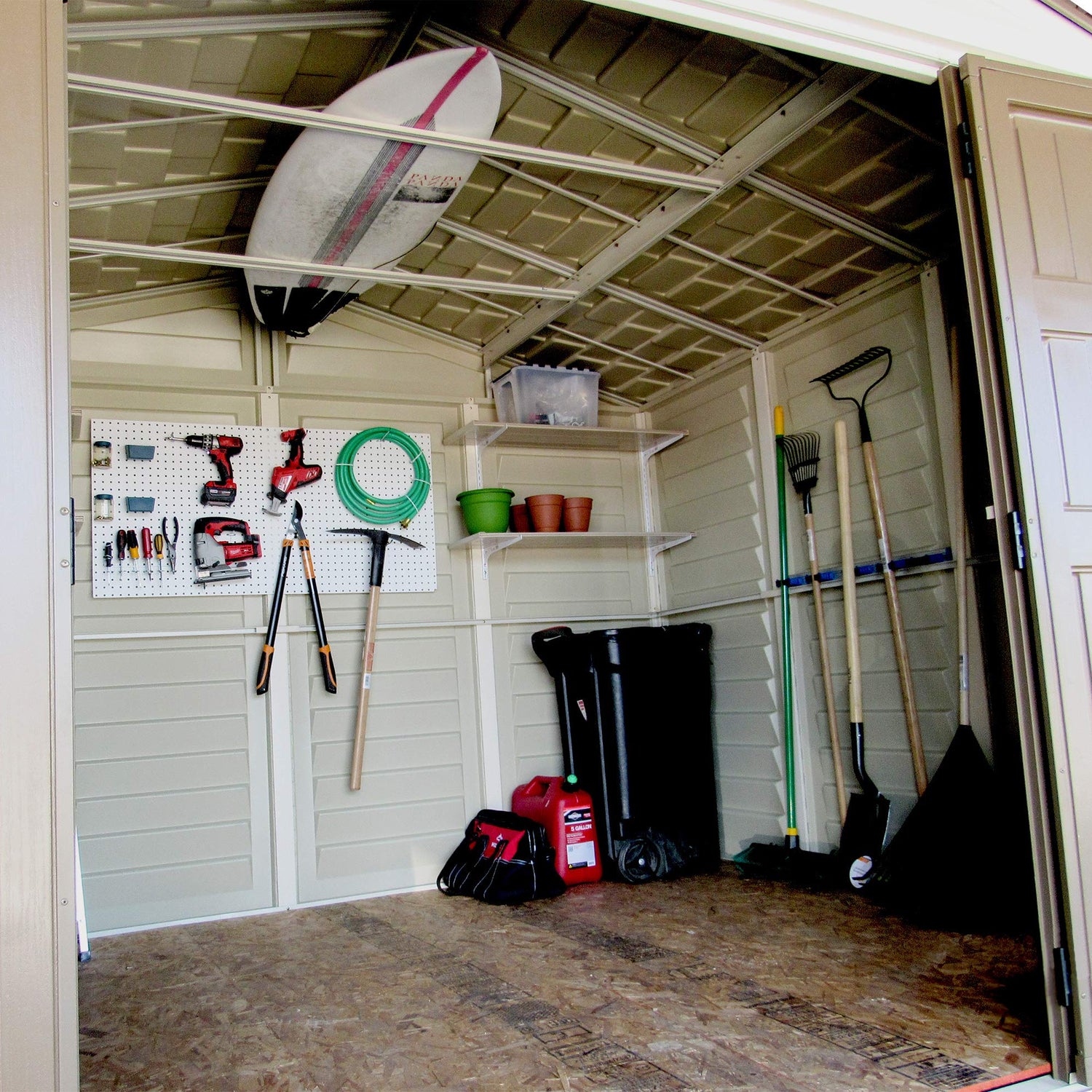 - Strong metal structure tested for 20 lb/sqft snow load; features steel reinforced columns to provide strength and durability and easy mounting of tools or shelves