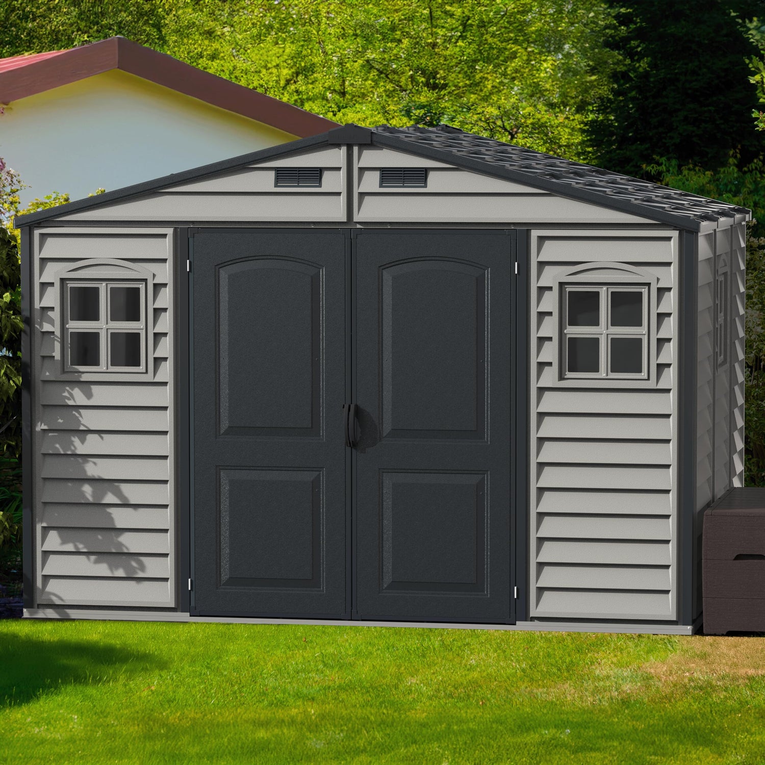 Duramax Woodside Plus 10 x 8 (8.02 m2) Plastic Garden Shed with 3 Fixed Windows & Metal Foundation Kit, Strong Metal Roof Structure Fire Retardant and Maintenance-Free Storage Shed - Dark Grey/Adobe