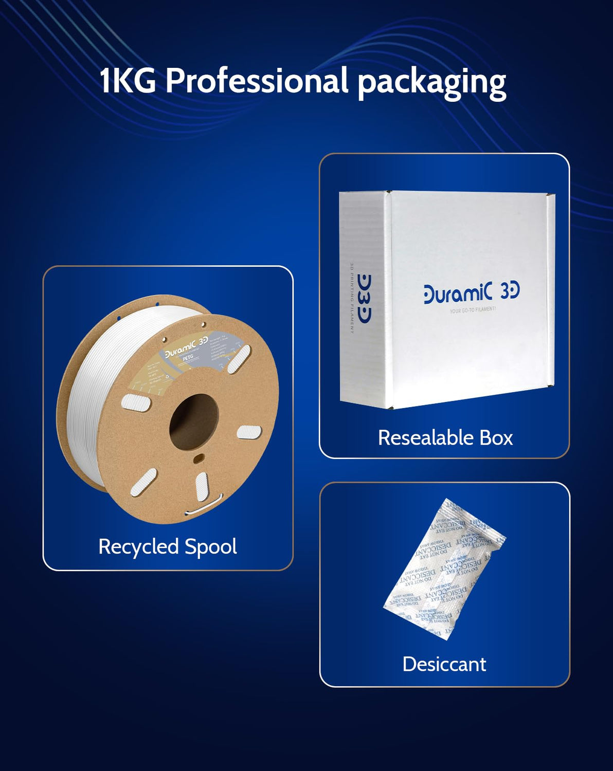 - PREMIUM PETG & COST-EFFECTIVE- Produced with high purity raw material without processed recycled waste, Duramic PETG filaments deliver exceptional quality and reliability to meet your everyday needs in design and prototyping while in its cost-effective price.