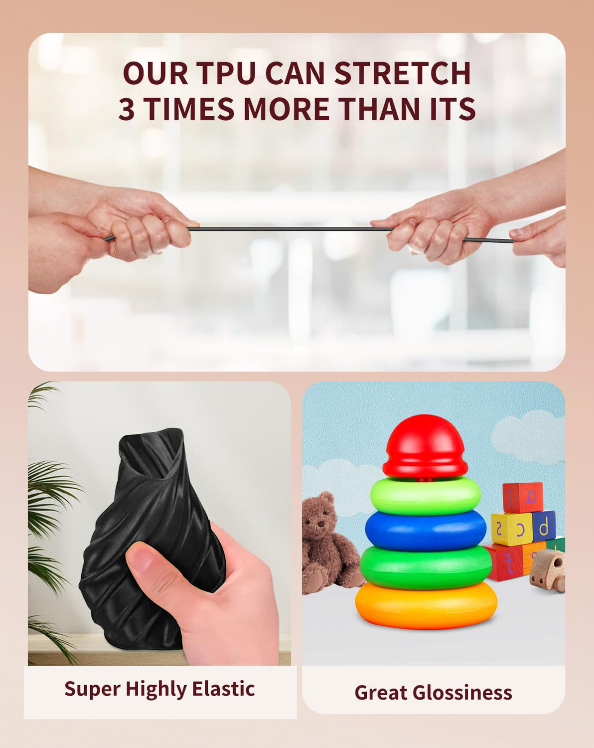 - High Elasticity & Strength - Duramic TPU filament 1.75mm features not only the high elasticity to stretch 3 times more than its original length, but also high strength resistance with shore hardness of 95A. Duramic TPU is a perfect choice if you want to print rubber-like flexible and resistant models, parts, jigs and tools, etc.