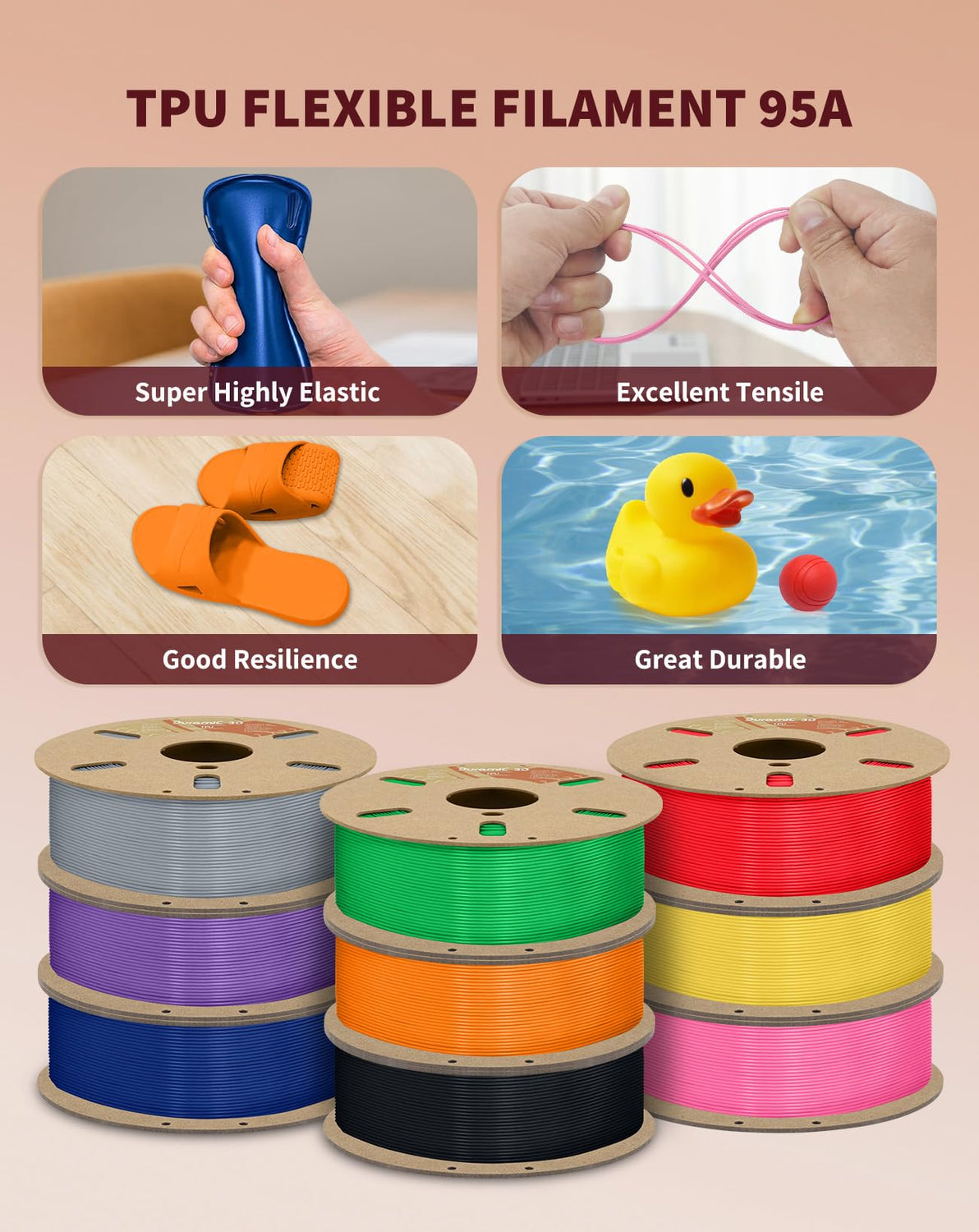 - SMOOTH & STABLE PRINTING - Duramic TPU filament 1.75mm is produced with jam-free patent, along with excellent layer adhesion, you can get smooth extrusion and stable printing experience without clogging. Recommended Nozzle Temp 220±10°C, bed temp 25-60°C and printing speed 20-40mm/s.