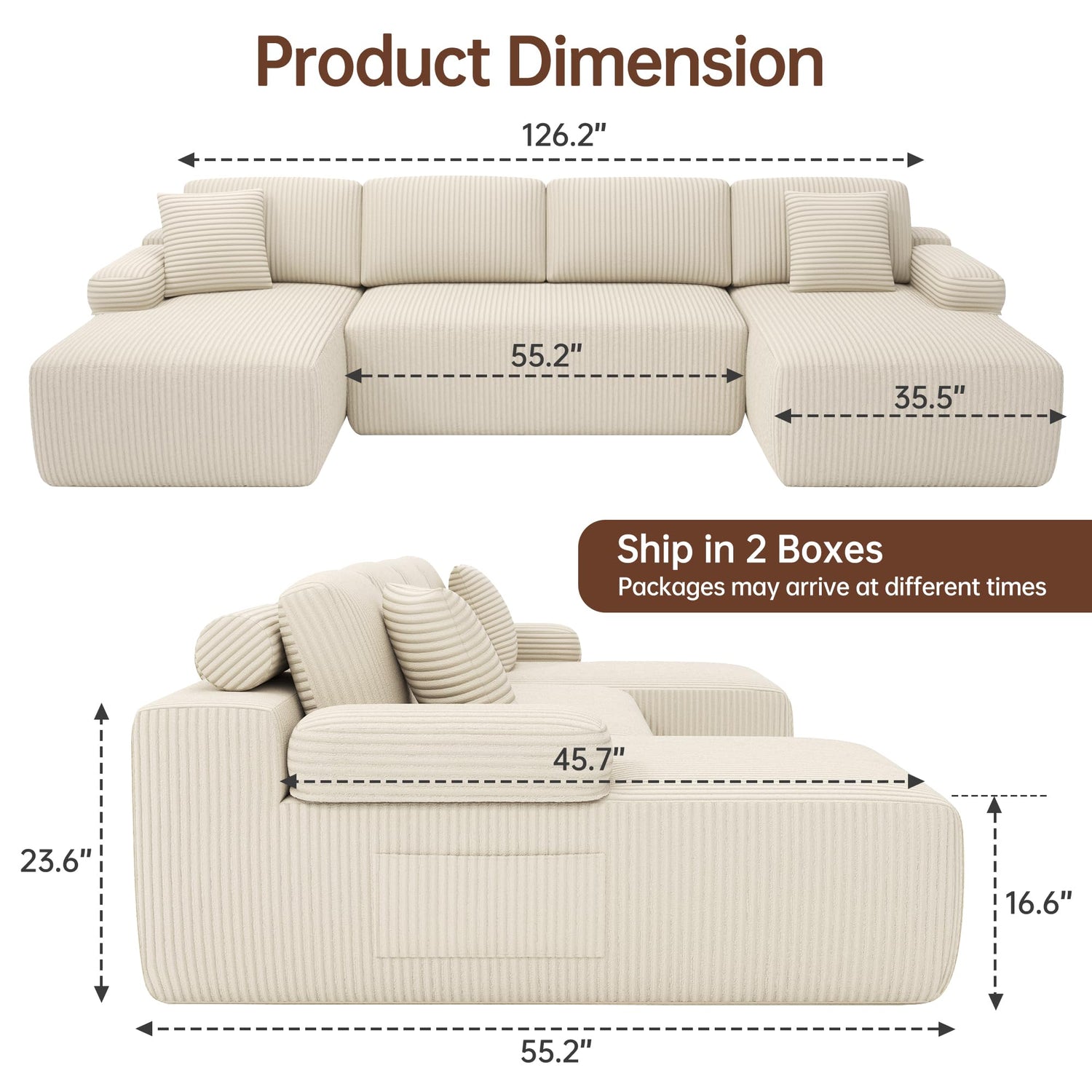 DURASPACE Cloud Sectional Couches, 126.2'' Modular U-Shaped Sofa with Deep Seat, Corduroy Boneless Sleeper Sofa Bed with Memory Foam for Living Room, No Assembly Required (Beige)