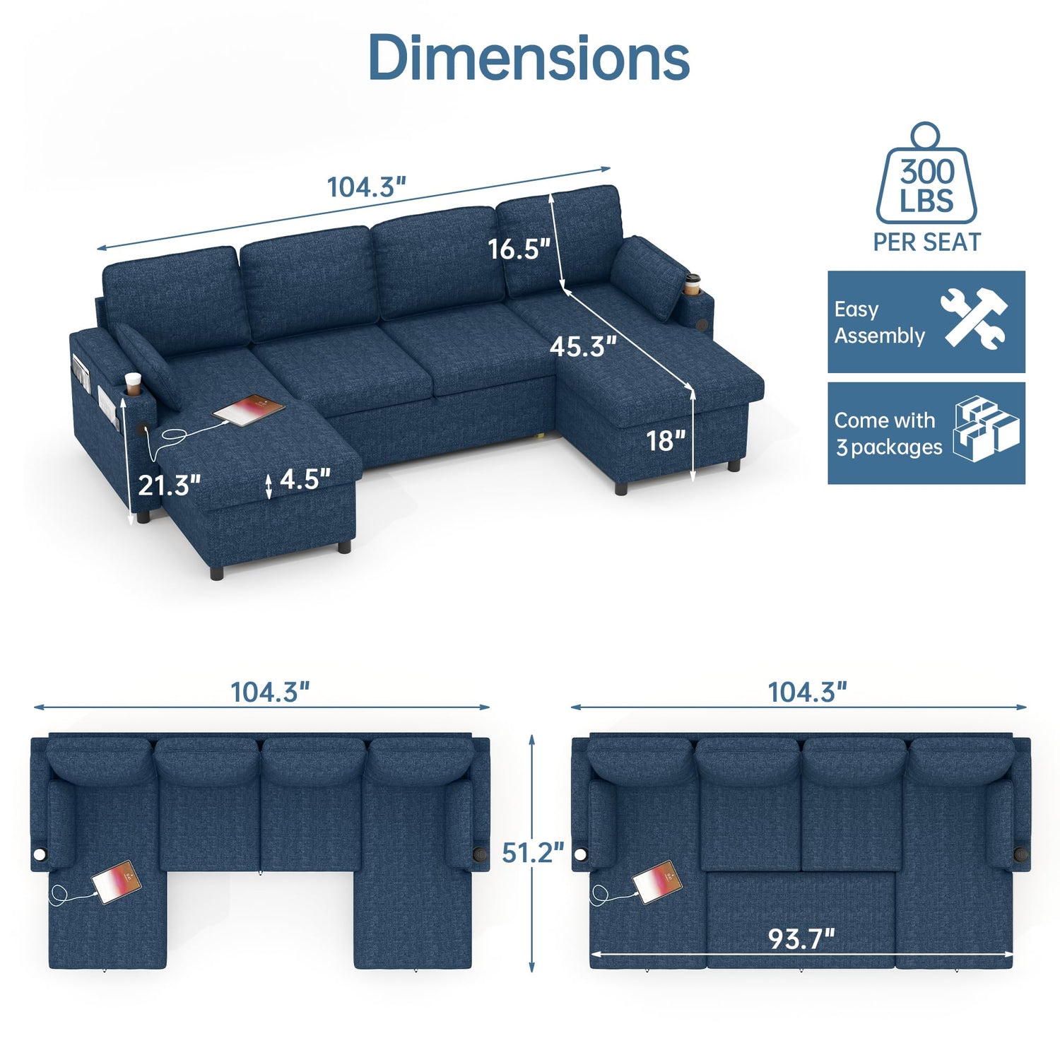 DURASPACE Sofa Bed Pull Out Couch Sleeper with Double Storage Chaise, U Shaped Convertible Sectional Sleeper Sofa for Living Room with USB Charging Ports, Cup Holder (Blue)