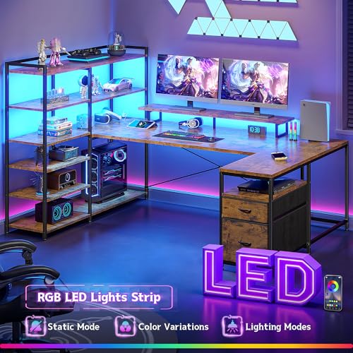 DurayLoly L Shaped Desk with Monitor Stand, 63'' Reversible U Shaped Office Desk with 6 Tire Storage Shelves & 2 Fabric Drawers, Gaming Desk with Power Outlet & LED Strip, Rustic Brown