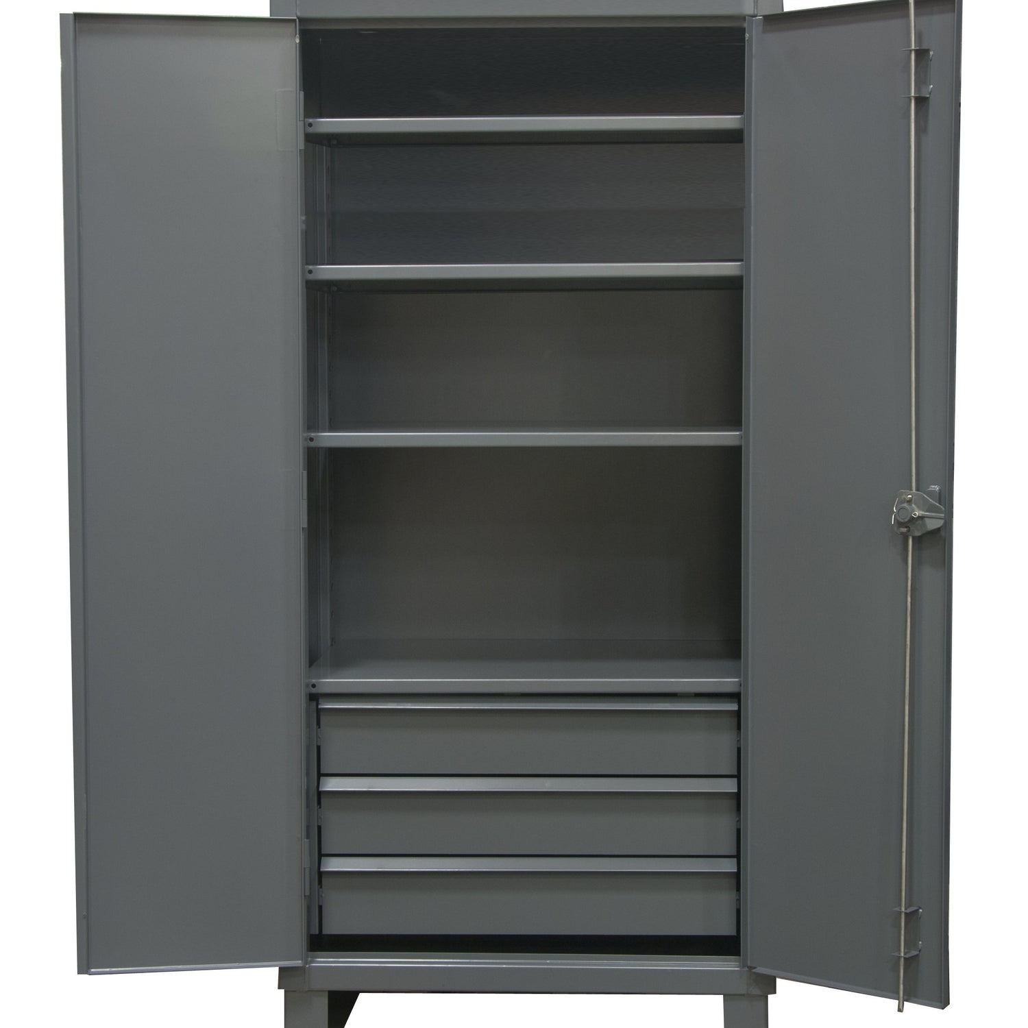 Details: Durham extra heavy duty all welded 12 gauge steel 3 drawers cabinet. 3-point cast steel locking handle with 3/8-inches diameter rods and provision for a padlock (padlock not provided). Shelves bolt into place easily using fasteners provided and adjust on 2-1/4-inches centers. Cabinets include 4 adjustable shelves. 6-inches height base/legs which provide access for forklifts; pre-drilled holes allow for lagging to the floor (constructed of 3/16-inches steel). Drawers each have 400 lbs capacity. Durable gray powder coat finish. Measures 24-inches length by 36-inches width by 78-inches height.
