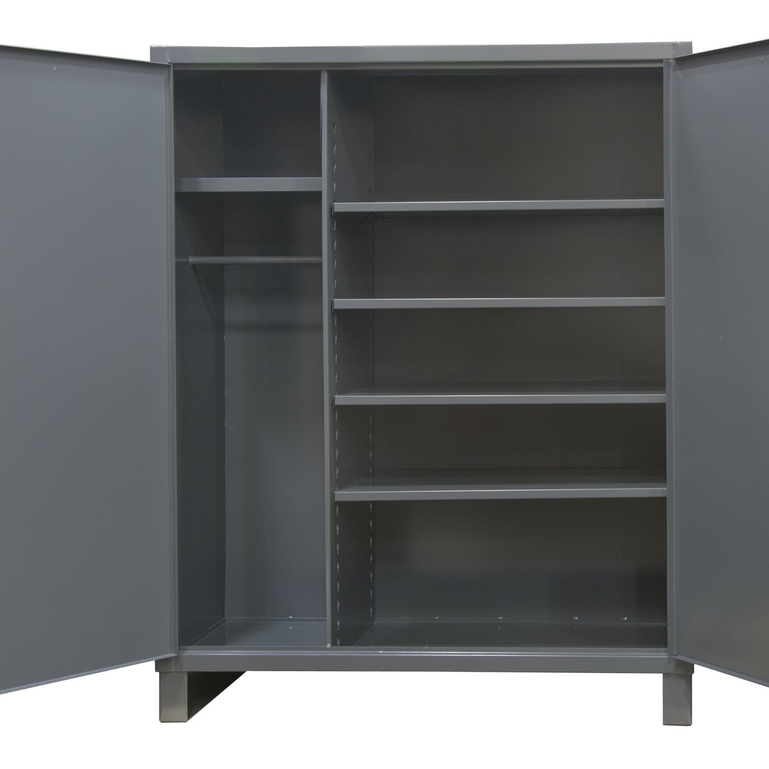 Details: Durham extra heavy duty all welded 12 gauge steel wardrobe cabinets with shelves. 3-point cast steel locking handle with 3/8-inches diameter rods and provision for a padlock (padlock not provided). 6-inches height base/legs which provide access for forklifts; pre-drilled holes allow for lagging to the floor (constructed of 3/16-inches steel). Shelves bolt into place easily using fasteners provided and adjust on 2-1/4-inches centers. Cabinets include 4 adjustable shelves, one storage compartment, and a rod for hanging apparel. Durable gray powder coat finish.
