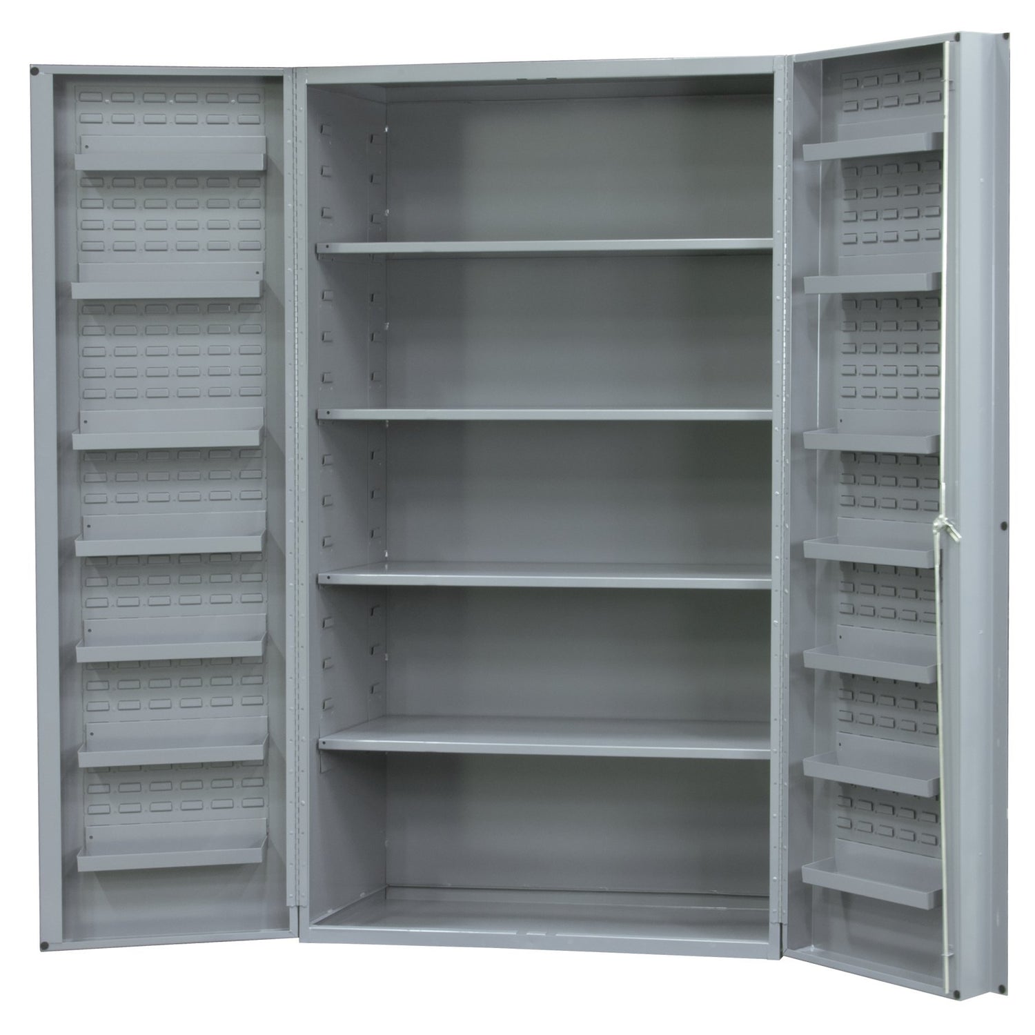 Durham cabinet with 4 shelves and 14 door shelves. Heavy duty all welded 14 gauge steel construction. Full height welded piano hinges for increased strength and rigidity of doors. Fully welded louvered panels reinforce door and hold 14 door shelves. Also, allows weight capacity of 650 pounds per door (evenly distributed). Adjustable shelves rest on louver uprights and adjust on 4-inches centers (no tools required). 3-point locking system with chrome keyed handle and 5/16-inches diameter lock rods. Main cabinet is 20-inches deep; box style 4-inches deep doors make full cabinet depth 24-inches. Durable gray powder coat finish. 4 shelves measure 47-1/2-inches length by 16-3/8-inches width; 14 door shelves measure 18-inches length by 4-inches width.