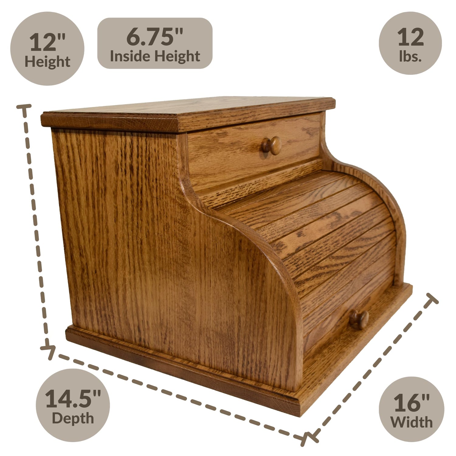 - Large Bread Box - 16" W x 14.5" D x 12" H. This solid oak wood bread box features a front roll-top door, ideal for storing tasty homemade bread loaves, bagels, rolls, and even pastries. Top pull-out drawer can hold utencils or other necessities.