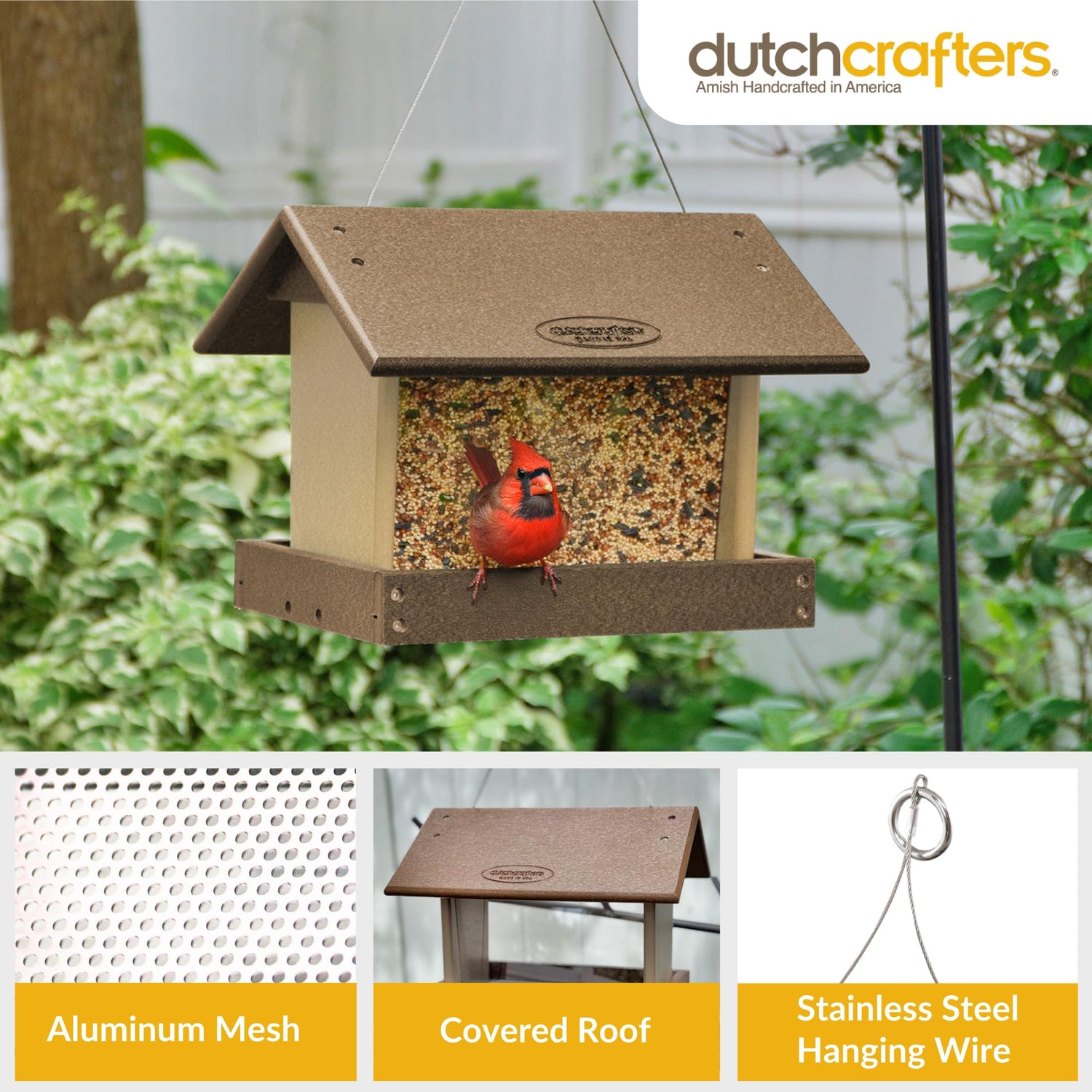- Heavy Duty Bird Feeder - Our hopper feeders for wild birds are crafted from HDPE recycled plastic poly lumber that is water resistant, making the covered bird feeder hopper durable and long lasting. Our recycled plastic bird feeder has an aluminum mesh tray for drainage, stainless steel hanging wire and hardware to prevent rust