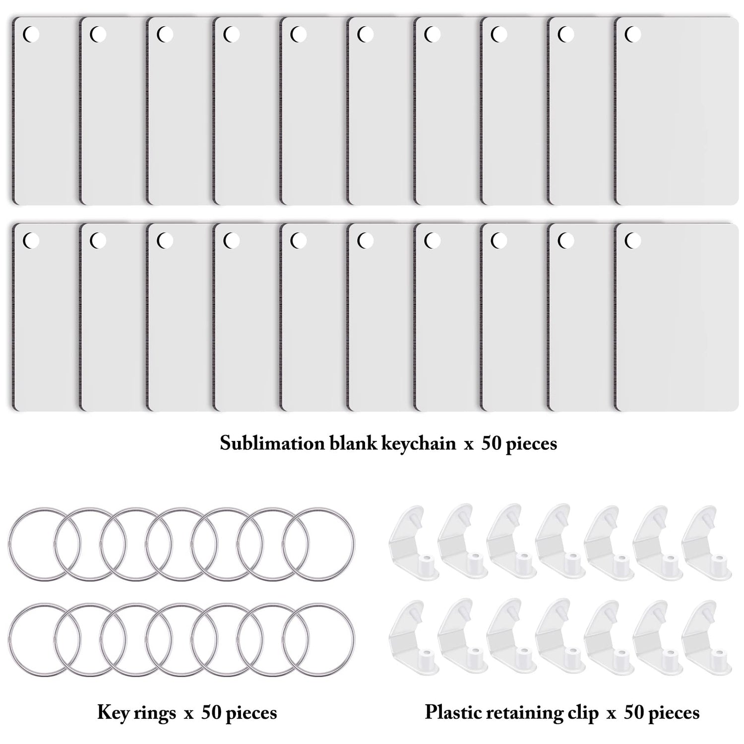 - Sublimation Blanks Set: package include 50 pieces rectangle sublimation keychain blanks, 50 pieces key rings, 50 pieces plastic retaining clips, 150 pieces keyring sublimation blanks set totally, adequate quantity keychain blanks set to meet your DIY craft needs