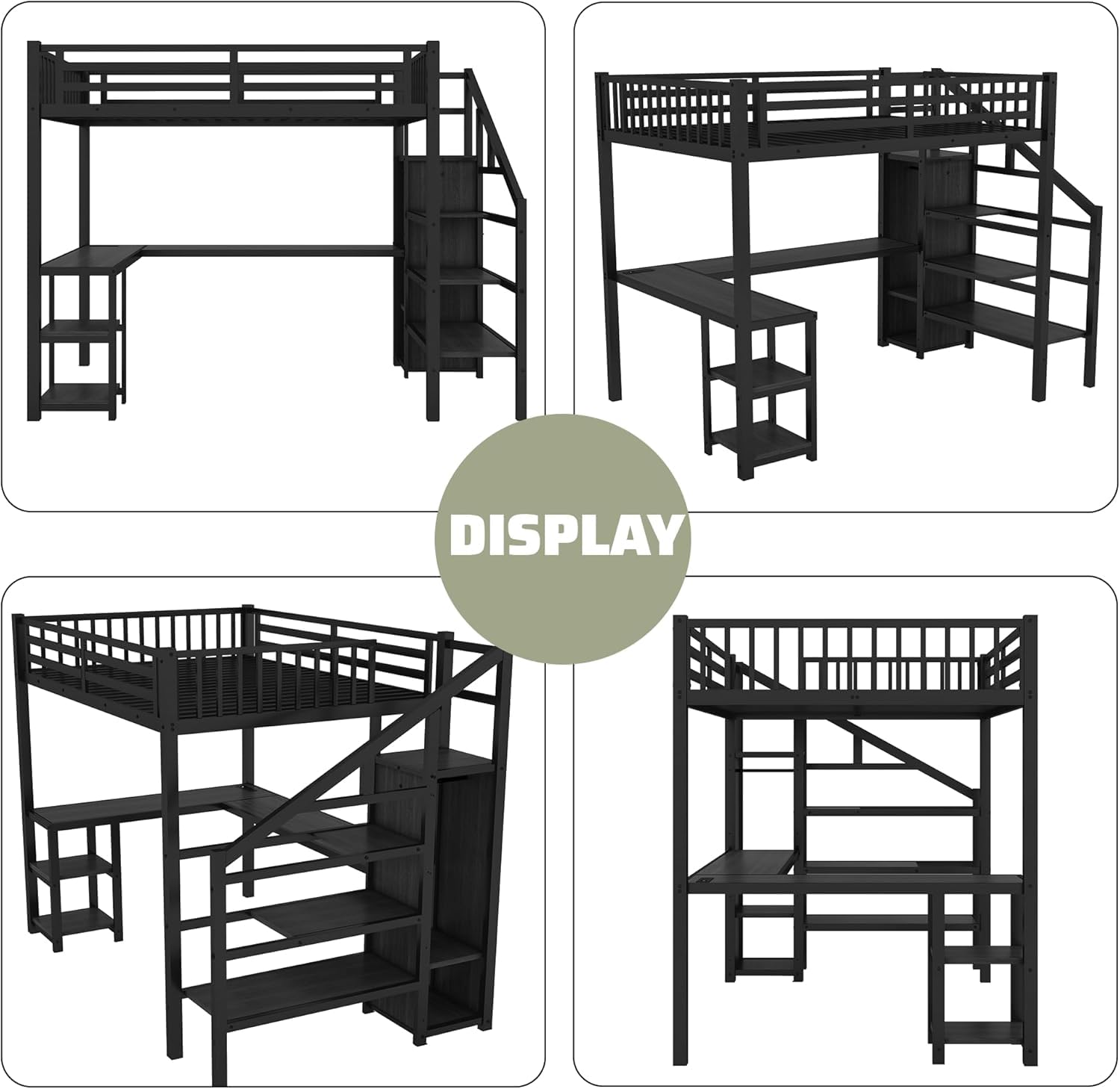 - 【Metal Loft Bed with Desk and Storage】: Our full loft bed frame comes with a desk and children's storage rack, making it perfect for freeing up extra space in a small bedroom. This functional loft bed includes an L-shaped table with 2 shelves under the table and a 55 inch clear space under the bed. the raised base creates a cozy space for storage, study or play to make the most of your space.