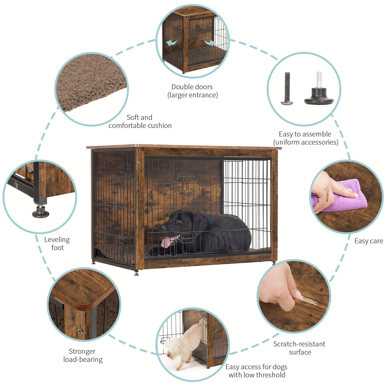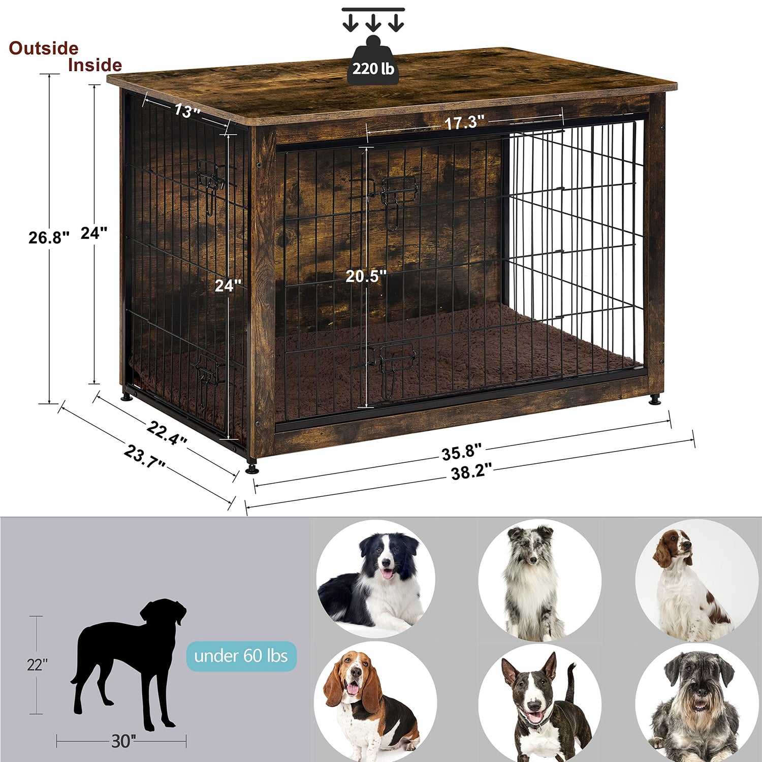 DWANTON Dog Crate Furniture with Cushion, Wooden Dog Crate Table, Double Doors Dog Furniture, Indoor Dog Kennel, Dog House, Dog Cage Large, 38.5" L, Rustic Brown