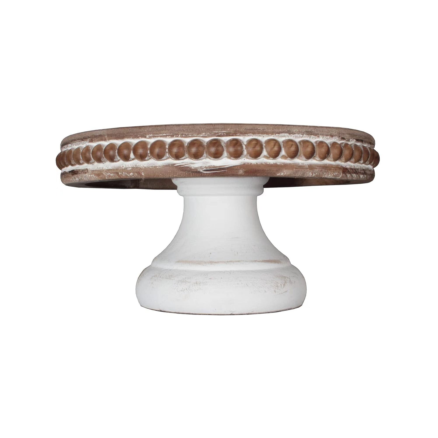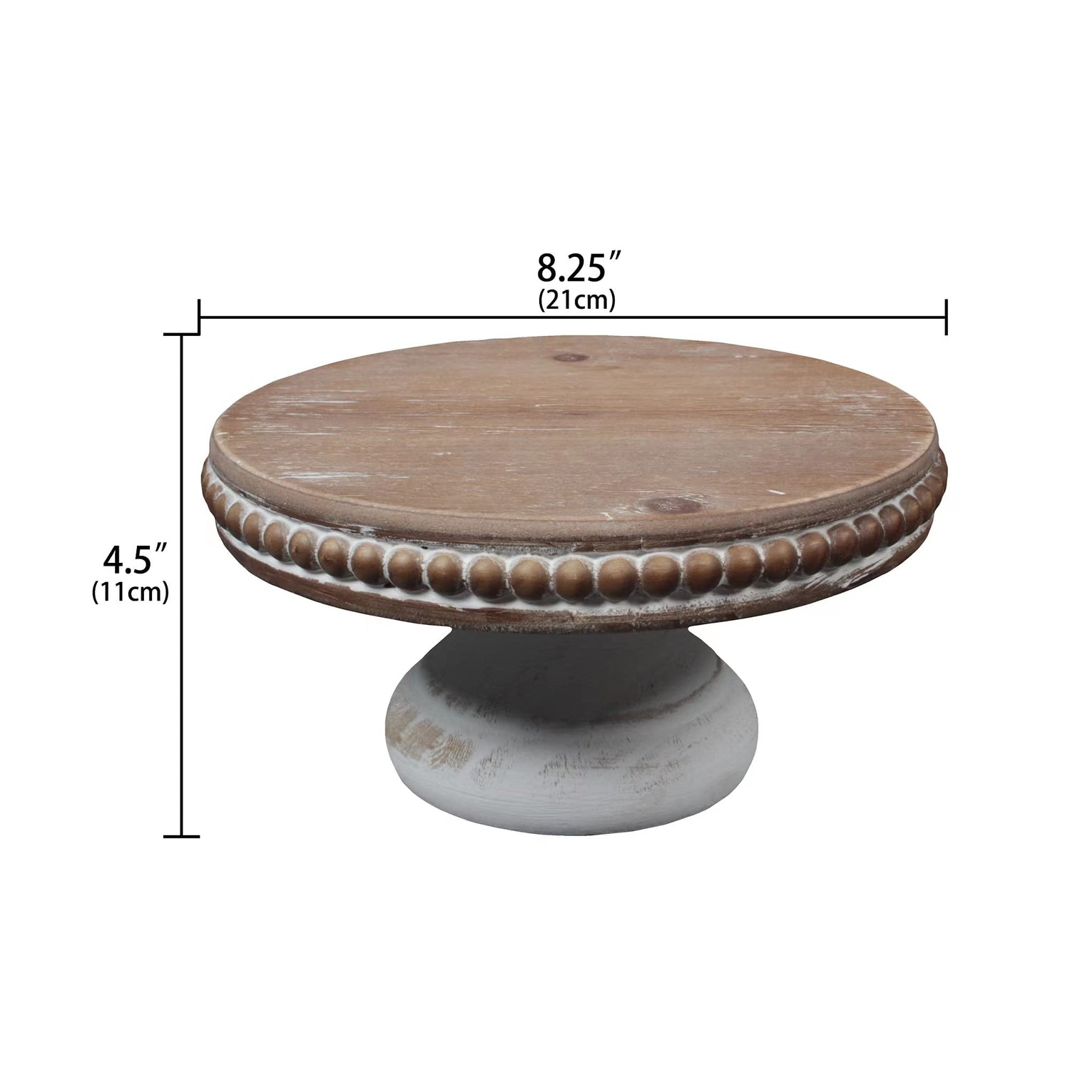dwellington White Wash Round Display Wood Riser, 8.25” Shabby Chic Pedestal Tray Decor with Beads, Farmhouse Display Stands for Coffee Bar, Bathroom, Kitchen Island