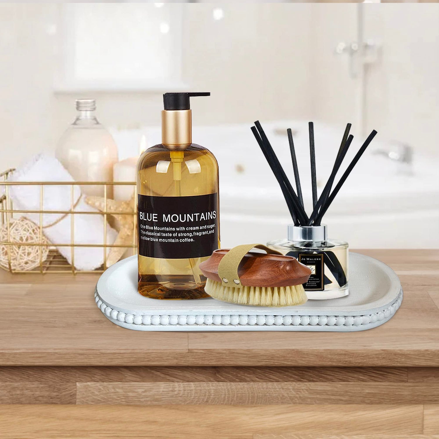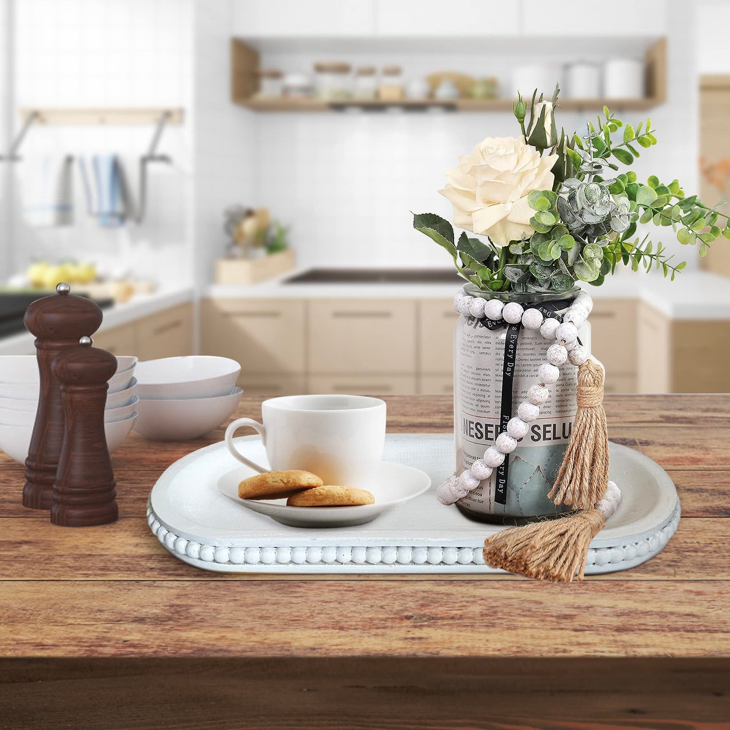 dwellington Wooden Farmhouse Decorative Tray, 12in Rustic Beaded Tray for Living Room Decor, Kitchen Table Décor, Oval Coffee Table Serving Tray (White)