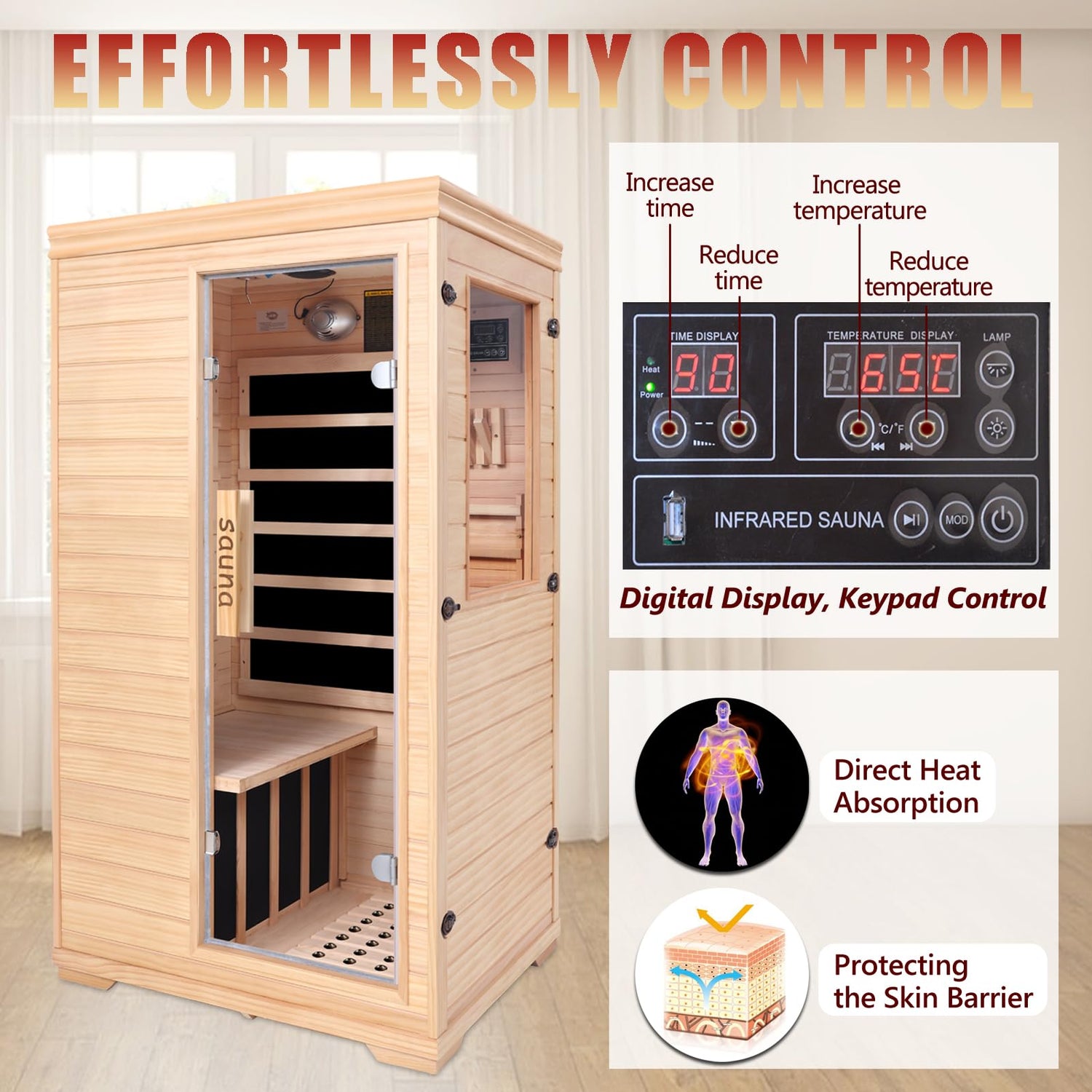 DWKWE Far Infrared Sauna Room, 1 Person Wood Side-Opening Indoor Home Sauna Low EMF 5 Heating Panels 1050W Infrared Therapy for Personal Wooden Dry Sauna Home Spa Room, beige