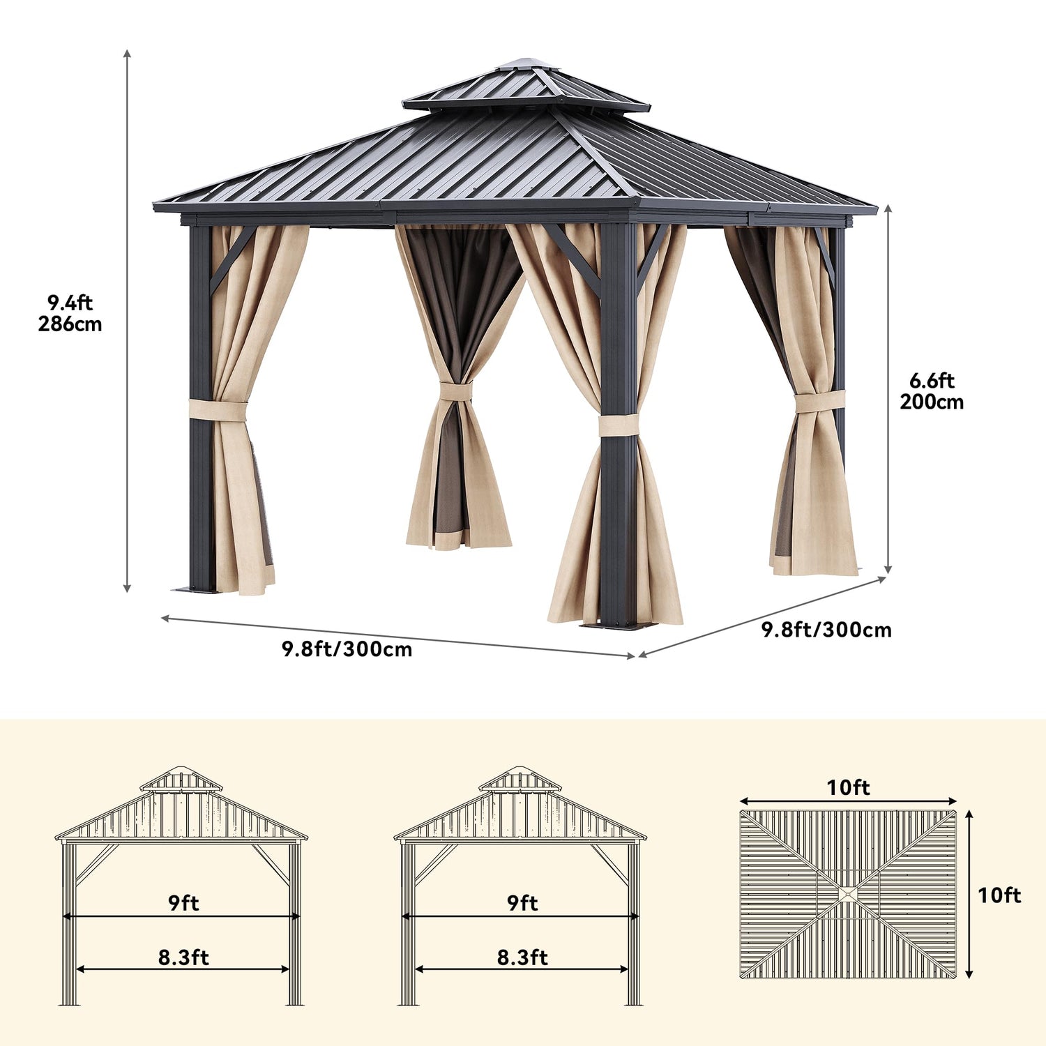 DWVO 10x10ft Hardtop Gazebo Double Roof with Nettings and Curtains, Heavy Duty Galvanized Steel Outdoor Vertical Stripes Roof for Patio, Backyard, Deck, Lawns, Brown