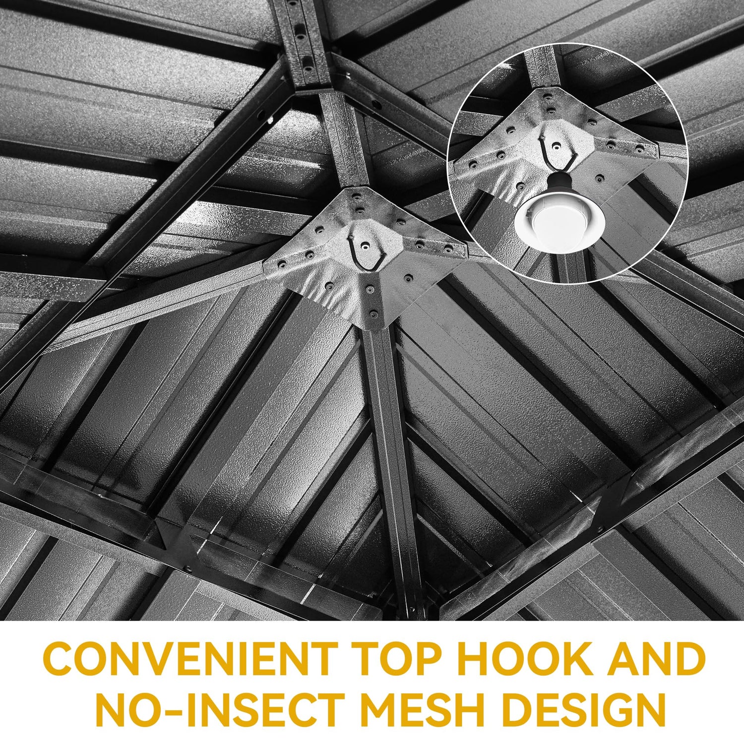 - GALVANIZED STEEL DOUBLE ROOF- our fade-resistant & rust-resistant galvanized steel roof making the metal gazebo strong enough to withhold heavy snow and wind; Double tops can reduce air pressure, circulate ventilation, comfortable and not stuffy; There is also one hook in the middle of the steel roof, you can hang an electric lamp or fan on it