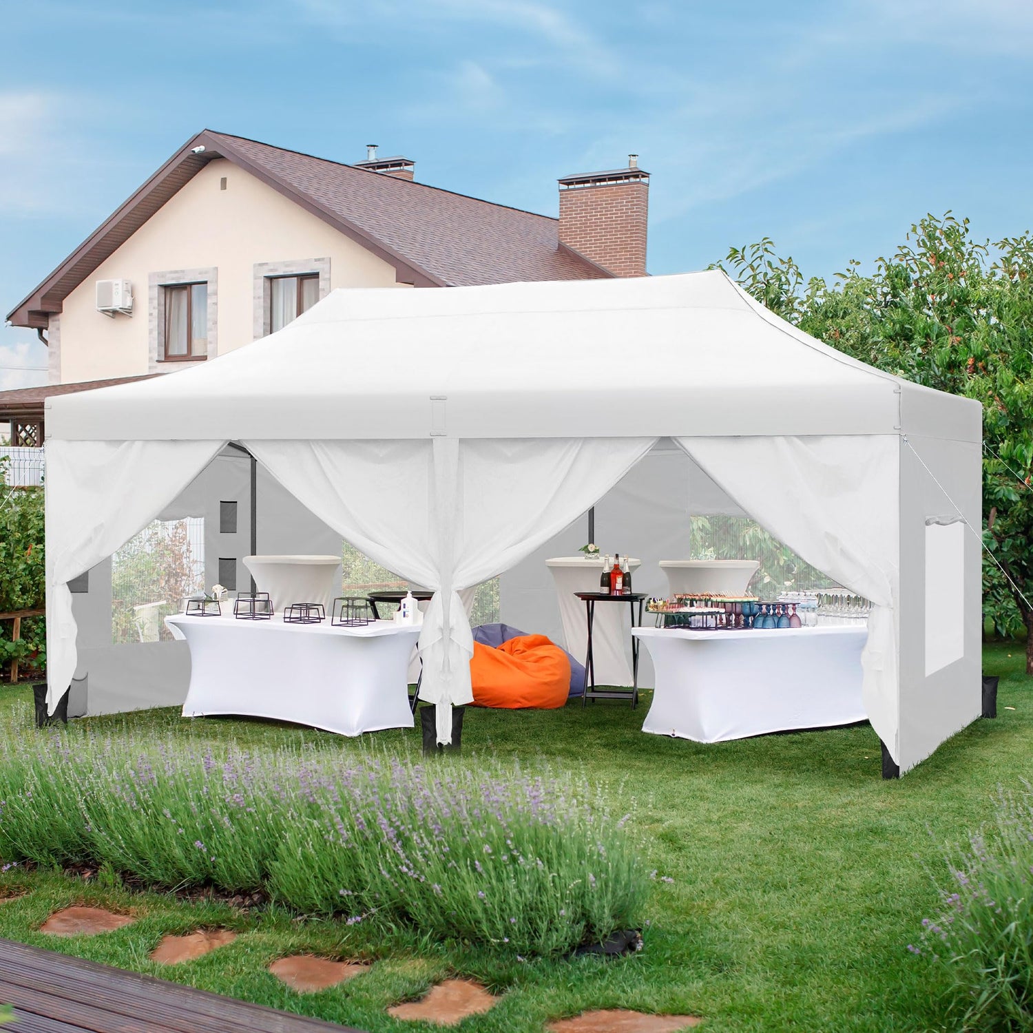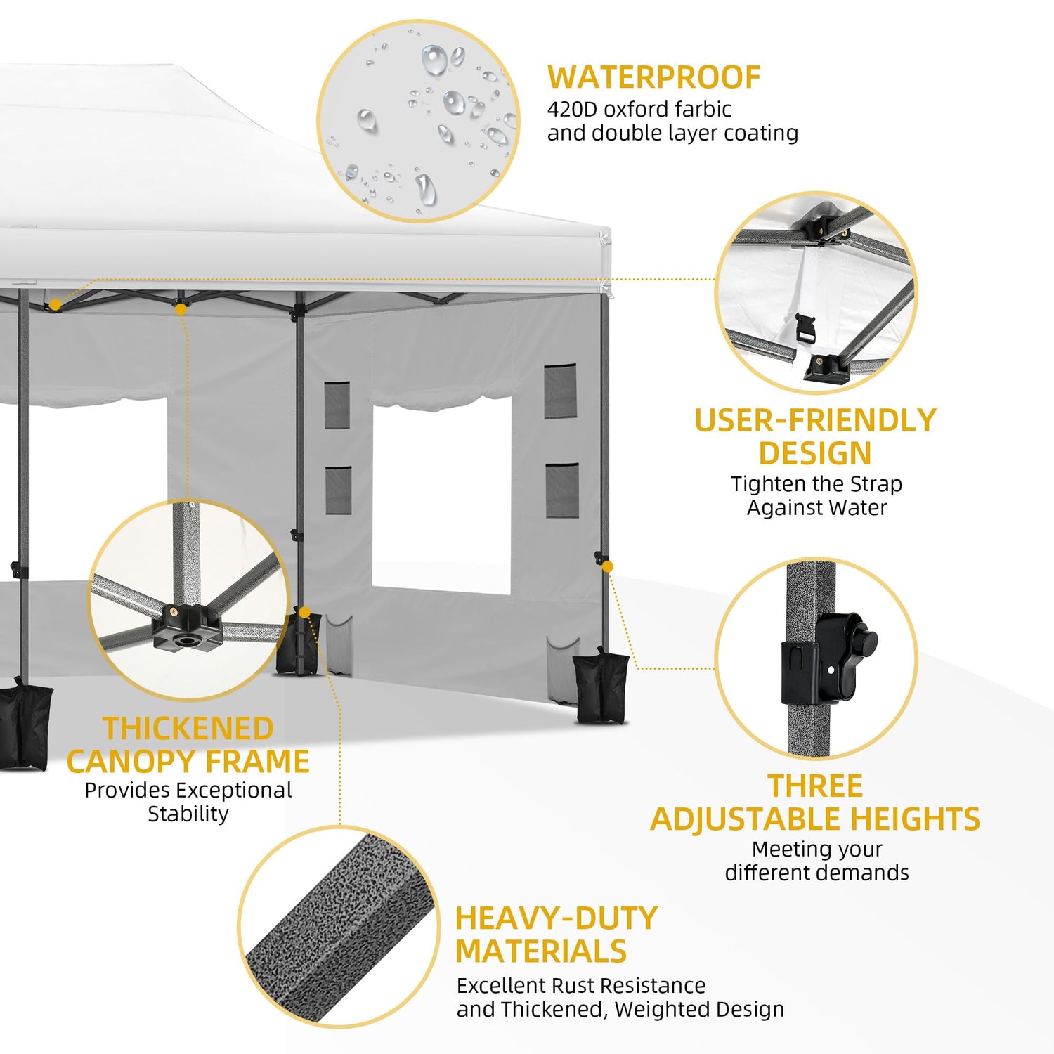 DWVO 10x20 Pop Up Heavy Duty Canopy Tent with 6 sidewalls, Roller Bag, 4 Ropes & 12 Stakes, 4 DIY Banners & 6 Sandbags for Patio, Party, Exhibition, Commerce (White)