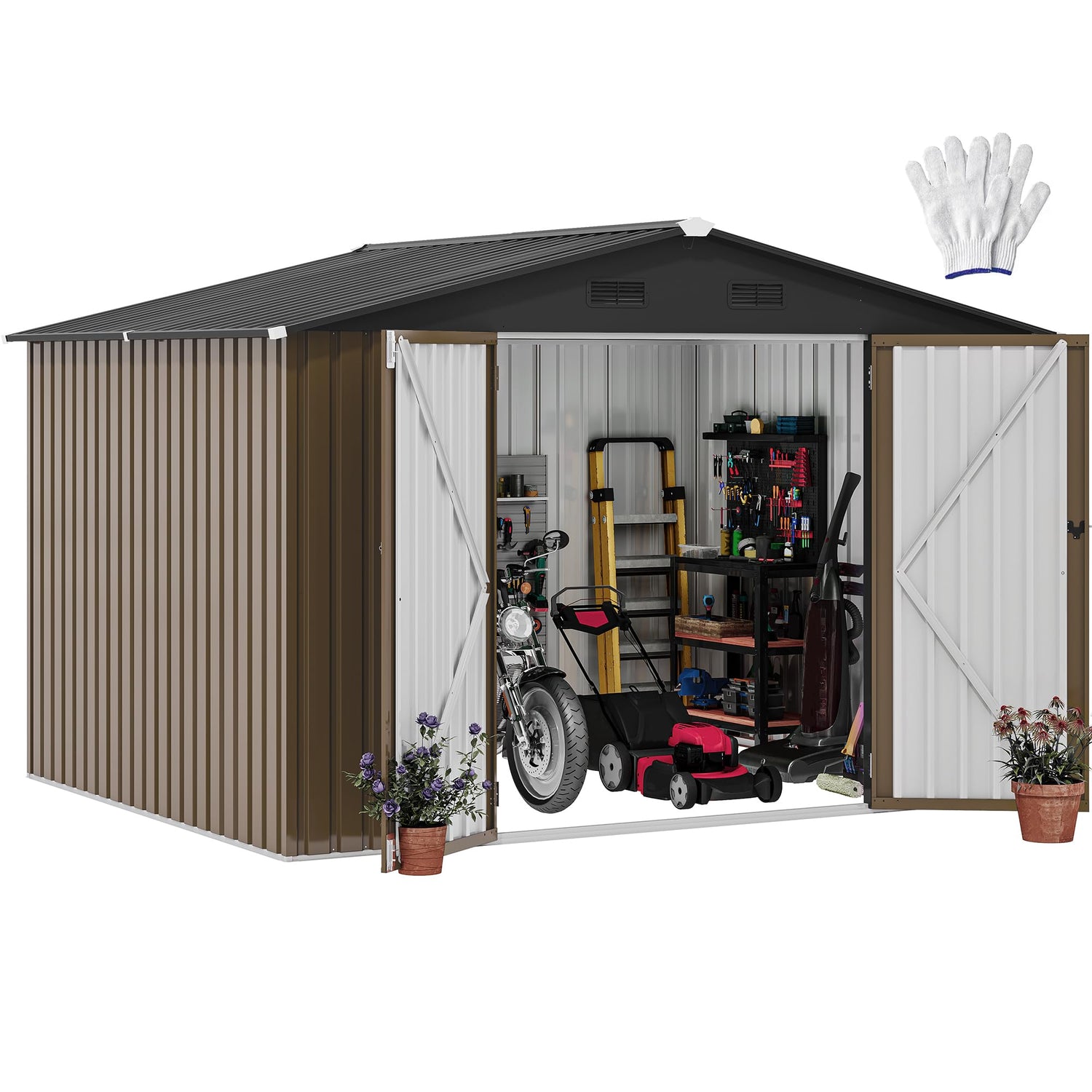 DWVO 10x8FT Outdoor Storage Shed, Spacious Metal Tool Shed with Lockable Doors & Ventilation for Patio, Lawn, and Backyard, Ideal for Storing Garden Equipment, Lawnmowers, and Bicycles, Brown