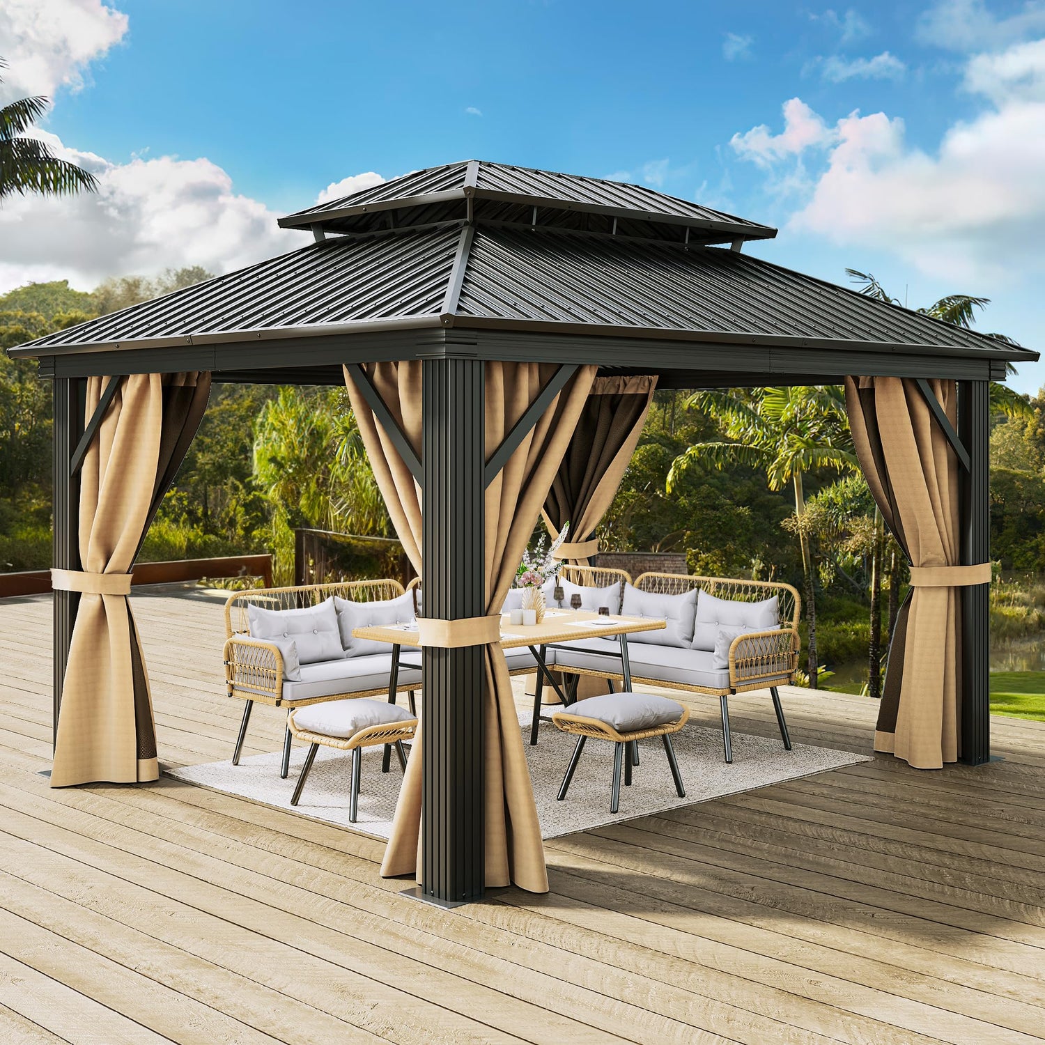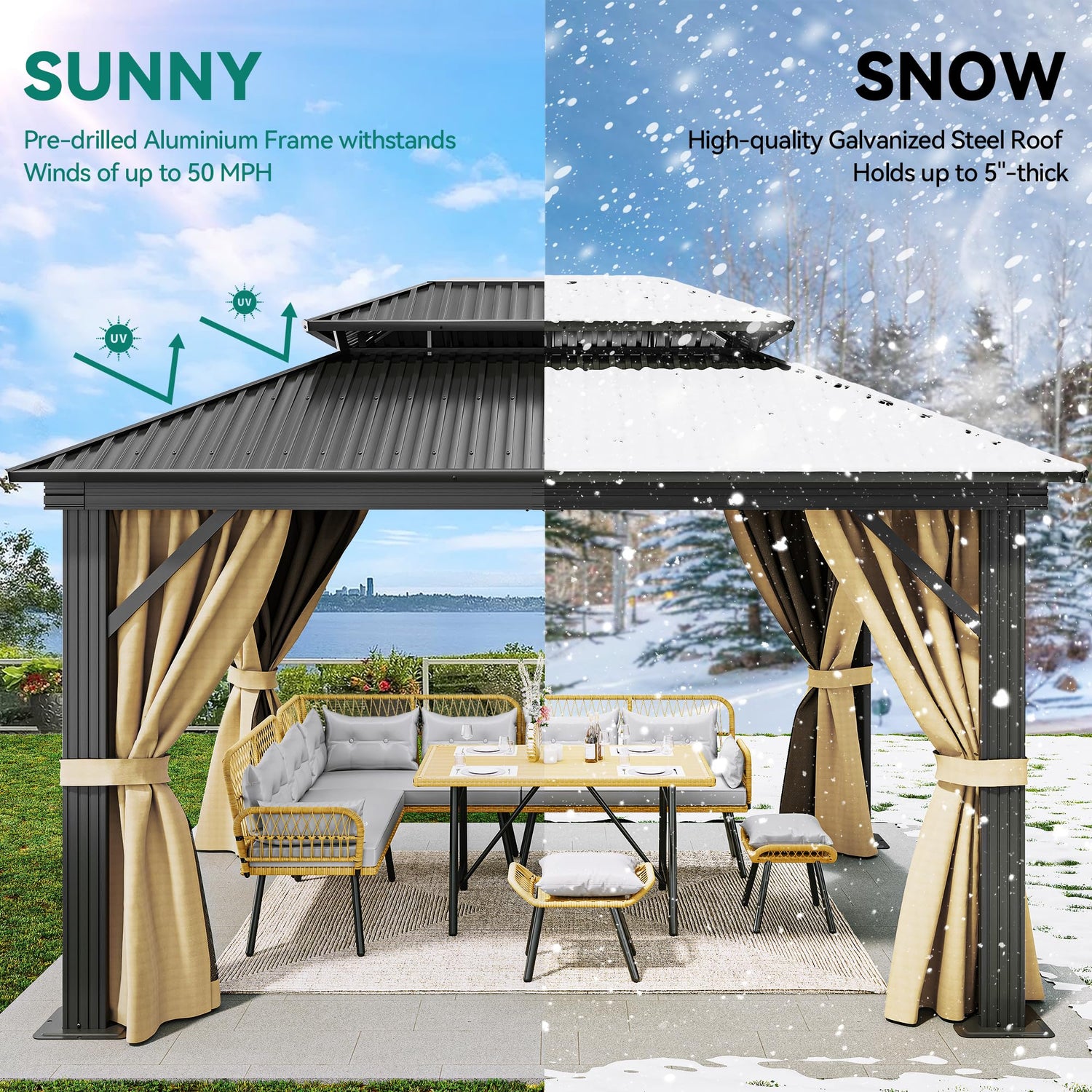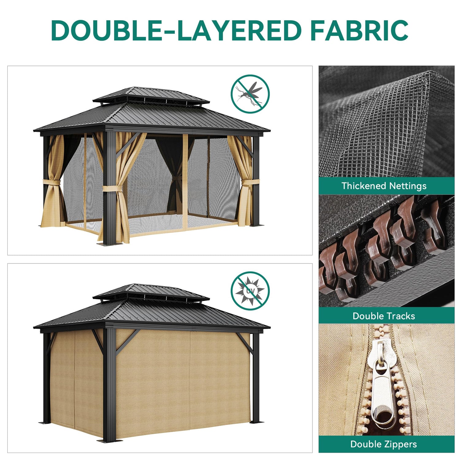 - DOUBLE LAYERED SIDEWALL- Hardtop gazebo features fully enclosed double-sided zipper, double trail system and double layer sidewall. Polyester cloth and mesh grant good ventilation and an open view; protect you from rain and UV rays while adding more privacy. Provide a safe and comfortable environment for your family and children