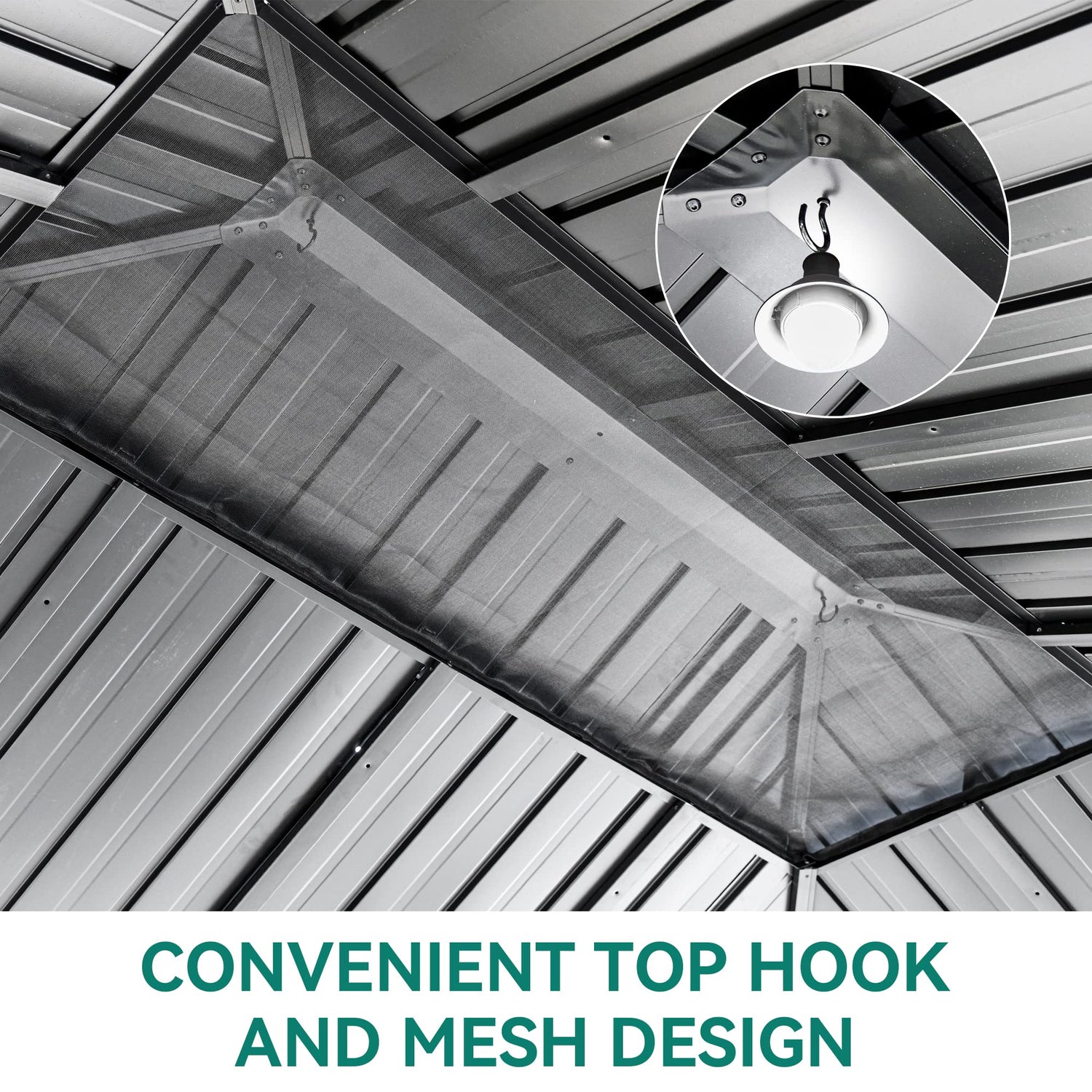 - DOUBLE ROOF GALVANIZED IRON TOP- Features a galvanized iron sheet top that prevents fading and prolongs service life. The roof is double top vented for optimum airflow and comfort during periods of strong wind. The middle of roof has a hook that can be hung with electric lights or fans to boost your pleasant outdoor time