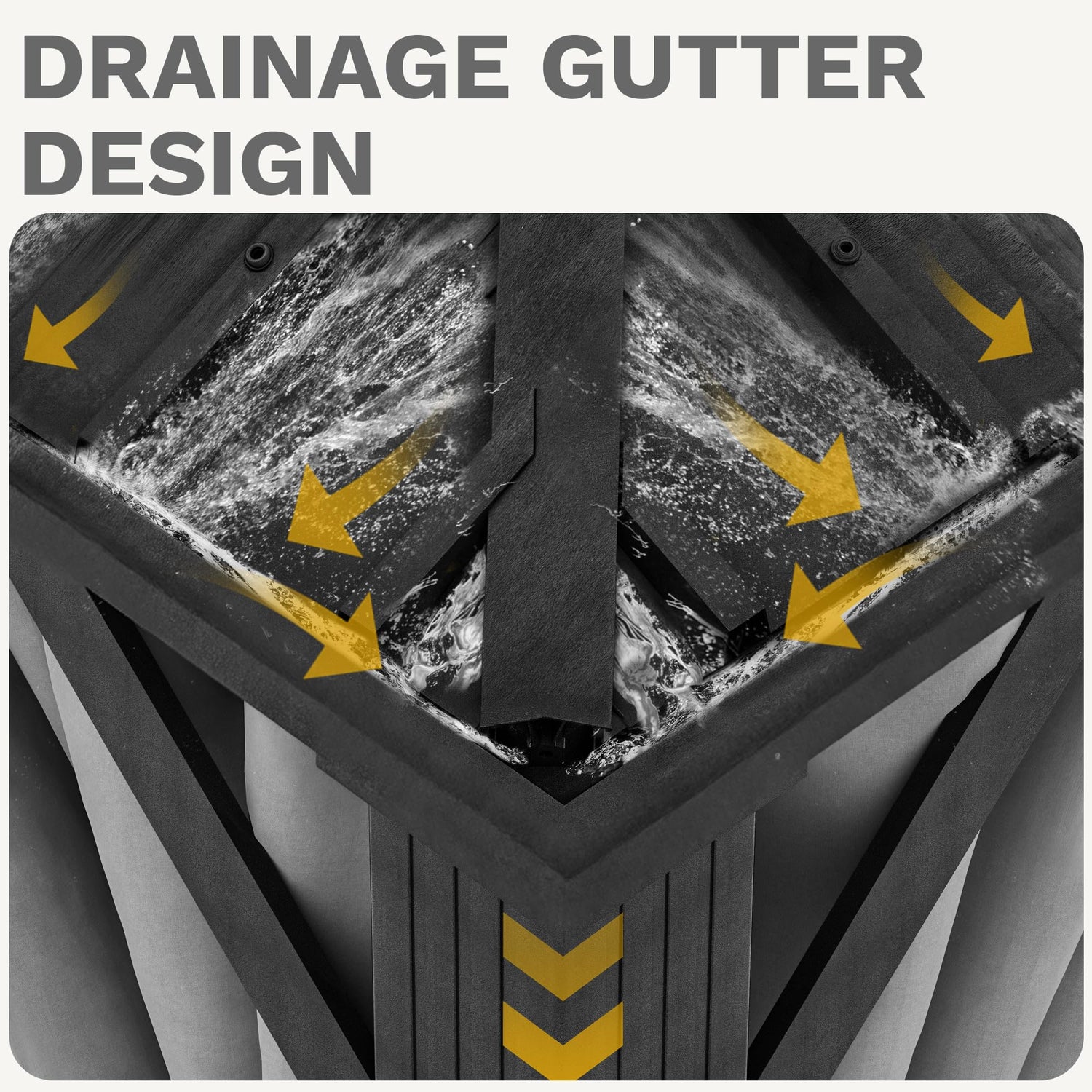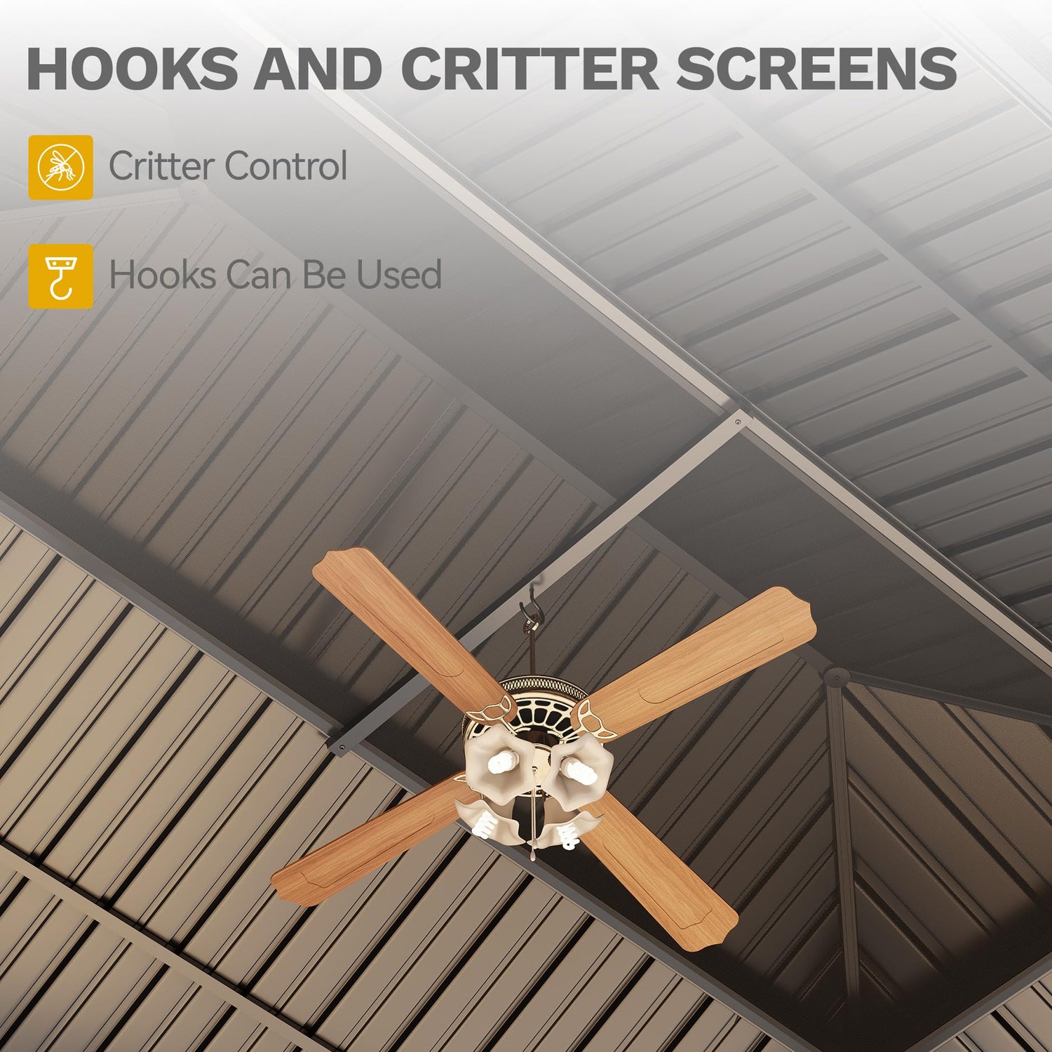 - DOUBLE ROOF GALVANIZED IRON TOP- Features a galvanized iron sheet top that prevents fading and prolongs service life of hardtop gazebo. The roof is double top vented for optimum airflow and comfort during periods of strong wind. The middle of roof has a hook that can be hung with electric lights or fans to boost your pleasant outdoor time