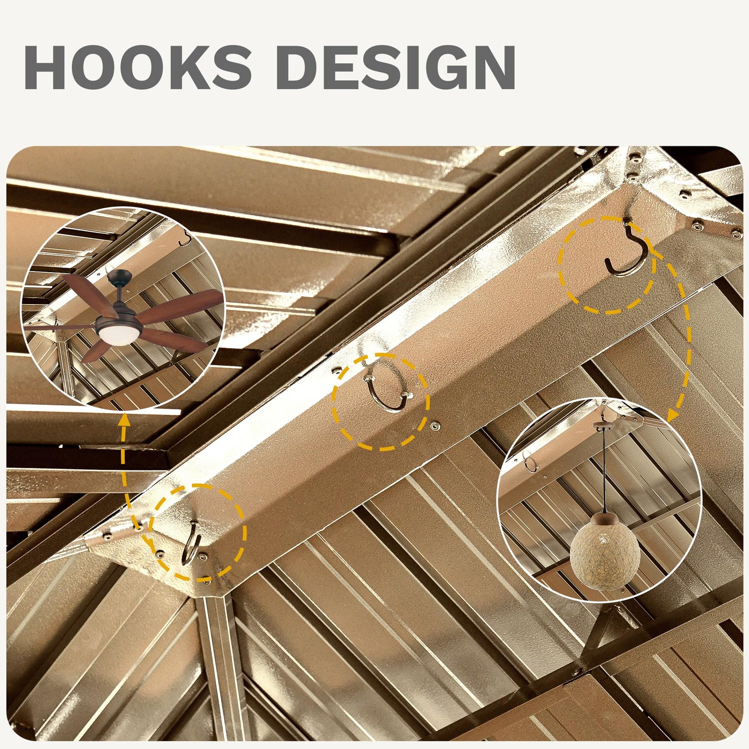 - DOUBLE COMBINED ROOF- The roof of the gazebo combined by small horizontal stripes top and large vertical stripes top; Features a galvanized iron sheet top that prevents fading and prolongs service life. The roof is double top vented for optimum airflow and comfort during periods of strong wind. The middle of roof has 3 hooks that can be hung with electric lights or fans to boost your pleasant outdoor time