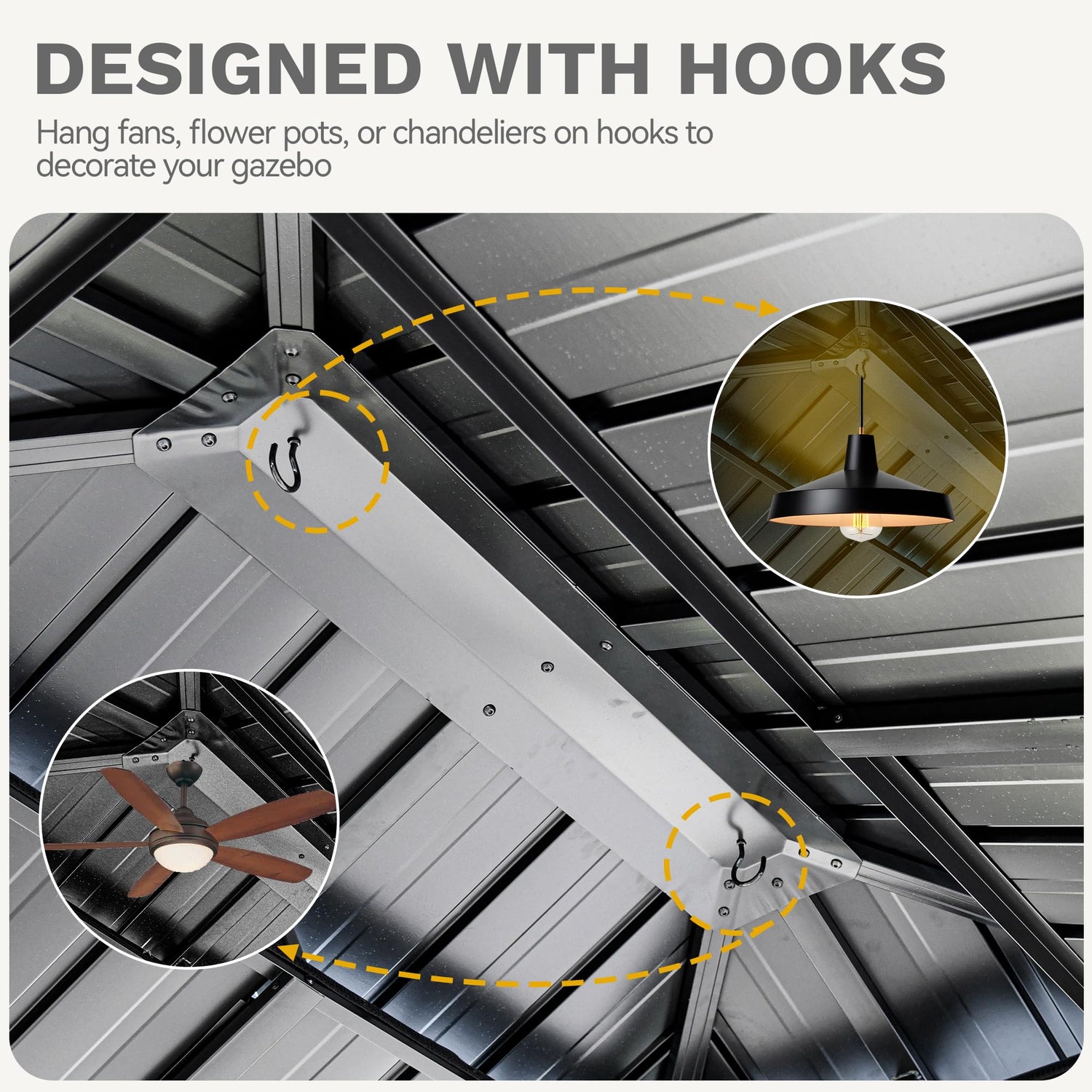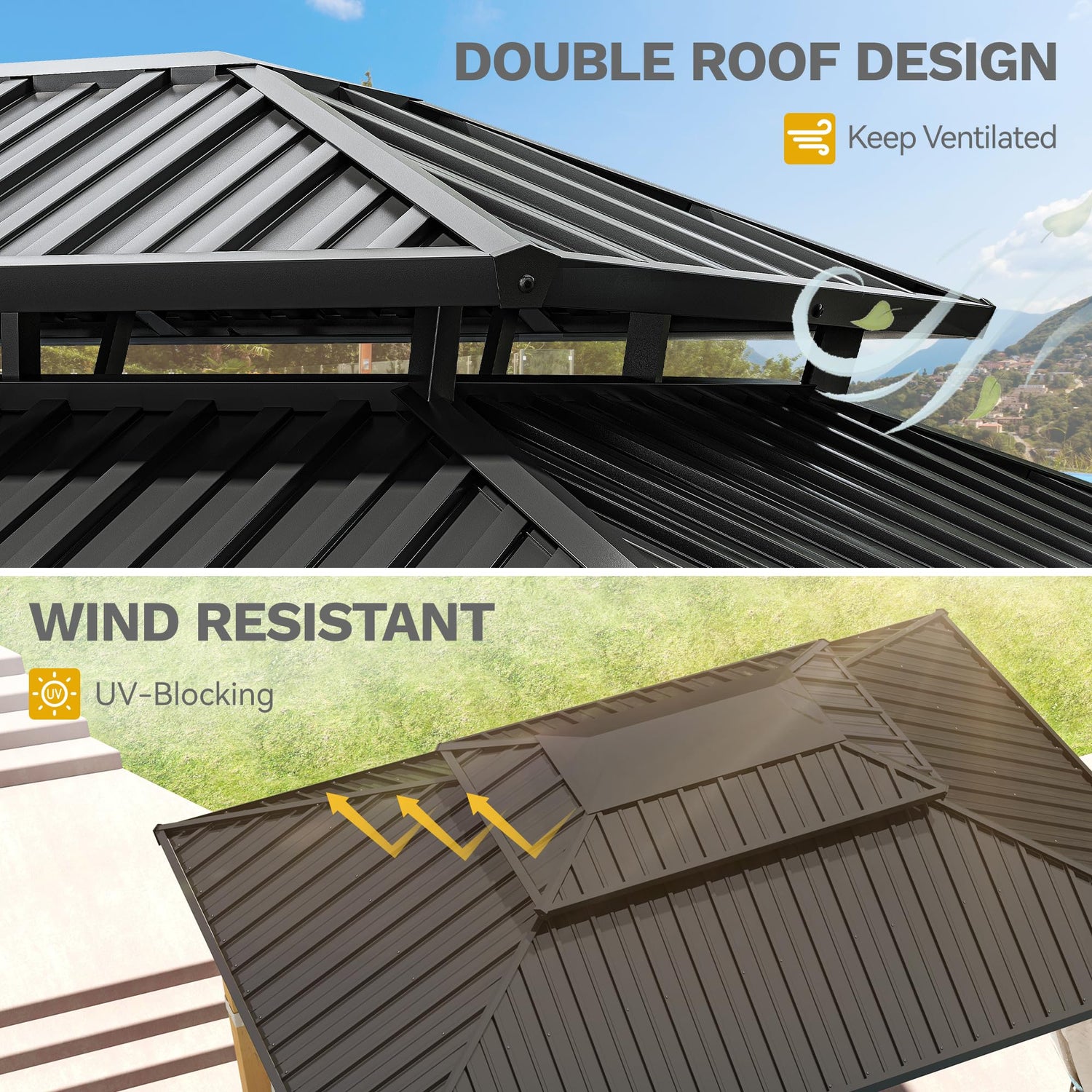 - DOUBLE ROOF - Galvanized iron sheet top, waterproof and UV-resistant, prevents fading and extends service life. The middle of the double-layered roof has ventilation openings, providing the best air circulation and comfort. There are two hooks in the middle of the roof, which can be used to hang electric lights or fans, increasing your pleasant outdoor time