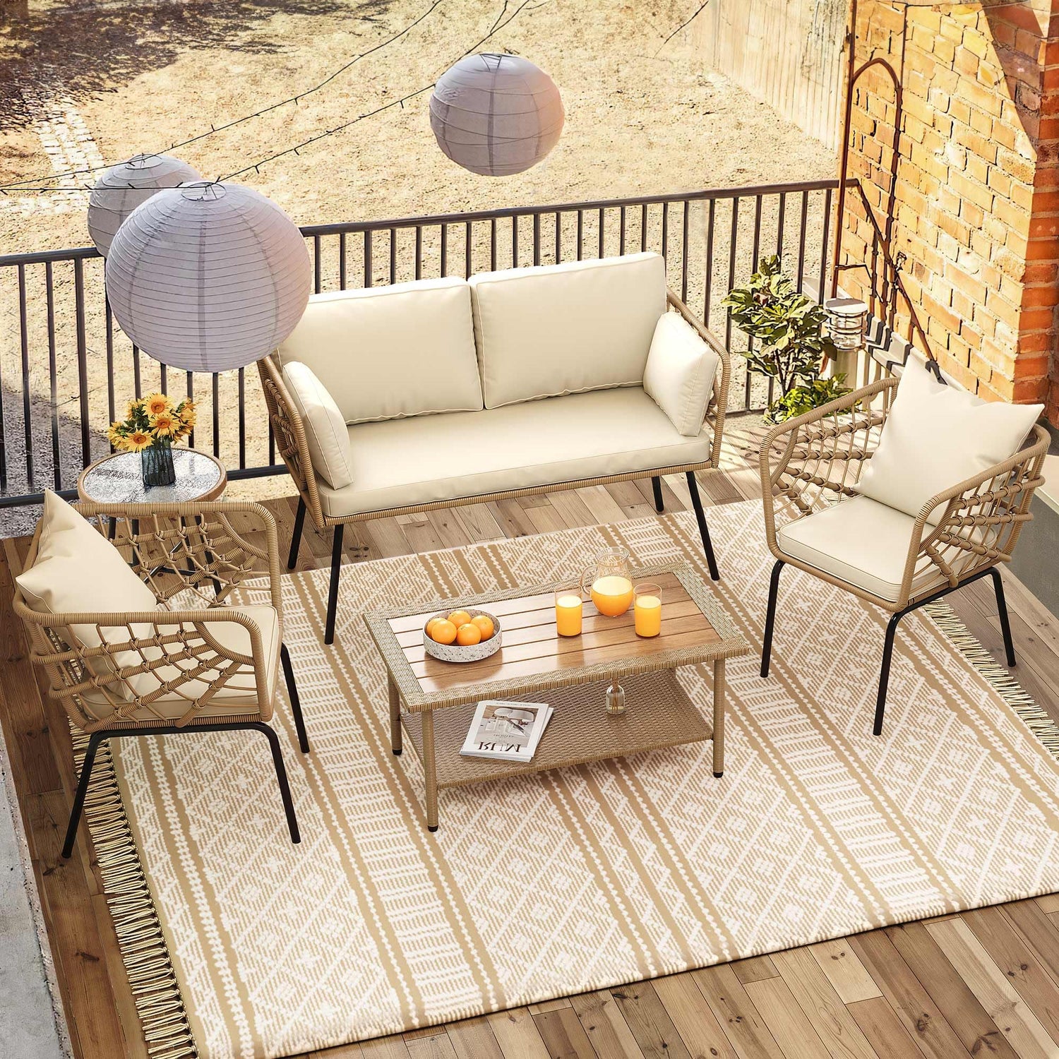 - Built Strong for Everyday Use: Made with a rust-resistant steel frame and handwoven all-weather PE wicker, this patio conversation set supports up to 529 lbs; Adjustable anti-slip feet keep everything steady, so you can relax without worry
