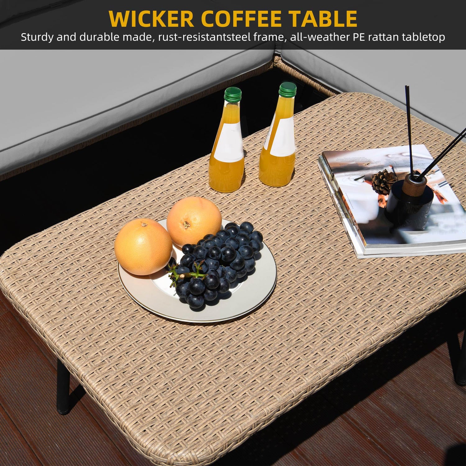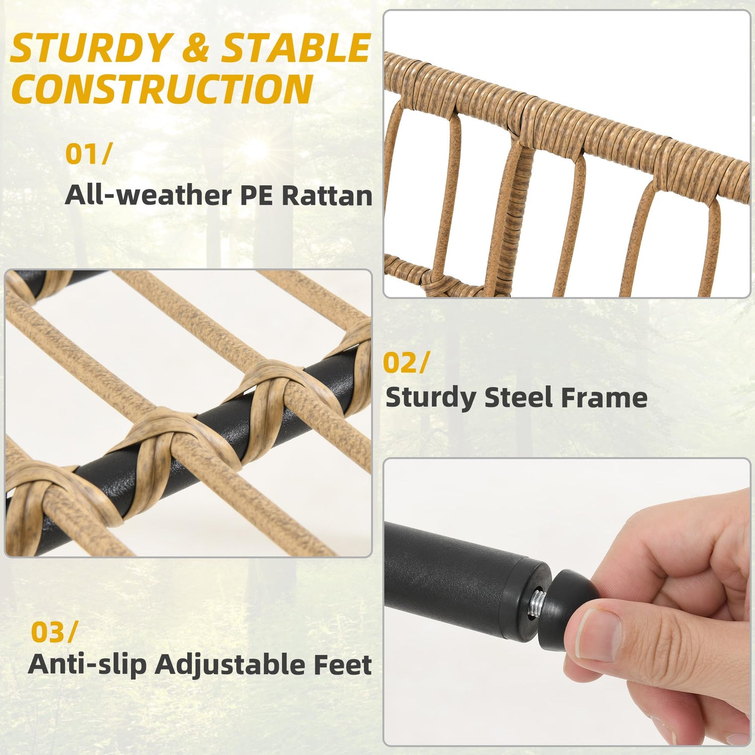 - All-Weather Durability: Crafted with water-resistant polyester fabric and PE rattan, this set withstands sun, rain, and humidity. The reinforced steel frame and non-slip feet ensure stability on uneven surfaces, supporting up to 794 lbs for worry-free use