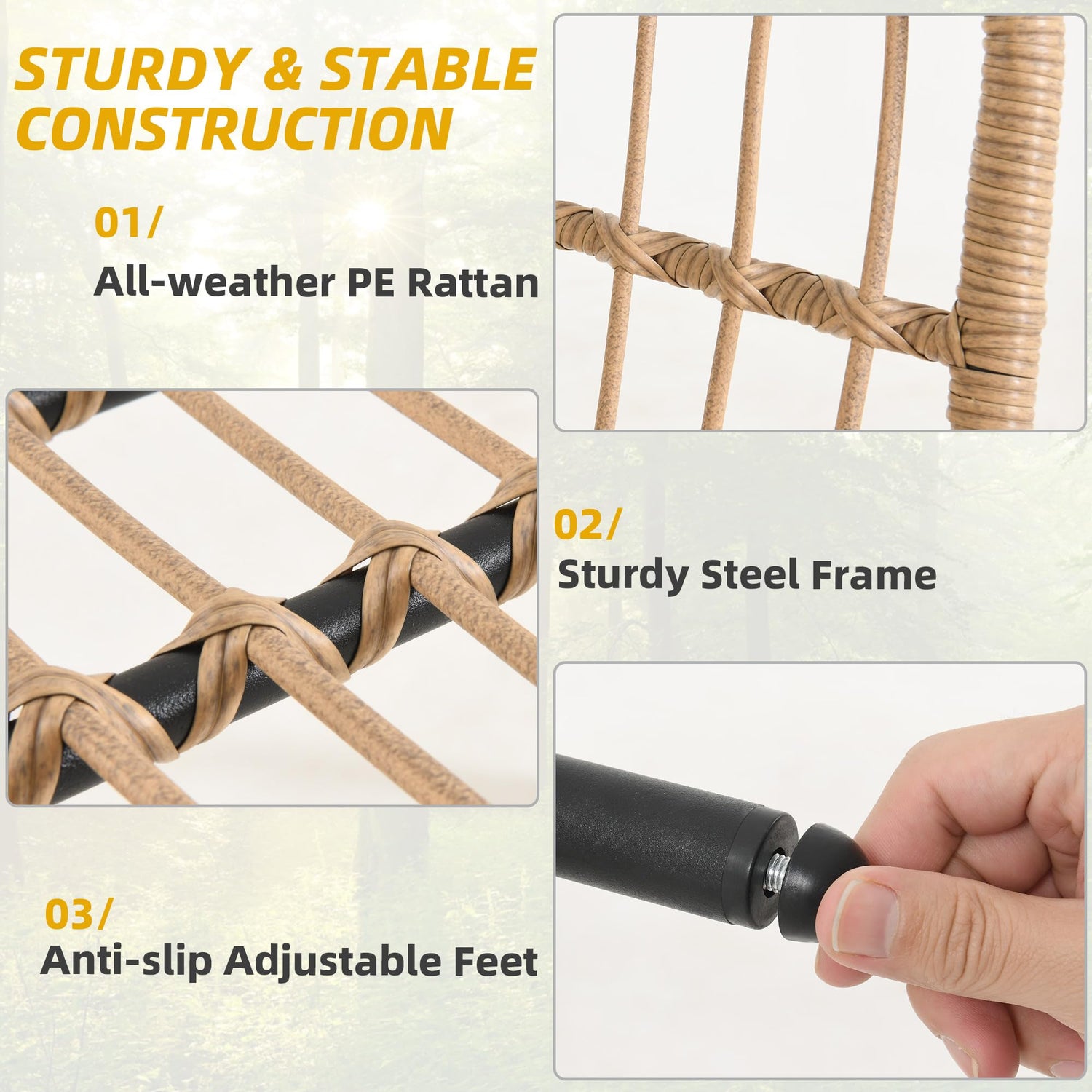 - Built to Last: Our outdoor sectional sofa features a powdered steel frame wrapped in durable PE wicker. Each piece supports up to 259 lbs (single) and 529 lbs (love-seat). With four adjustable non-slip feet, you'll stay stable even on uneven ground