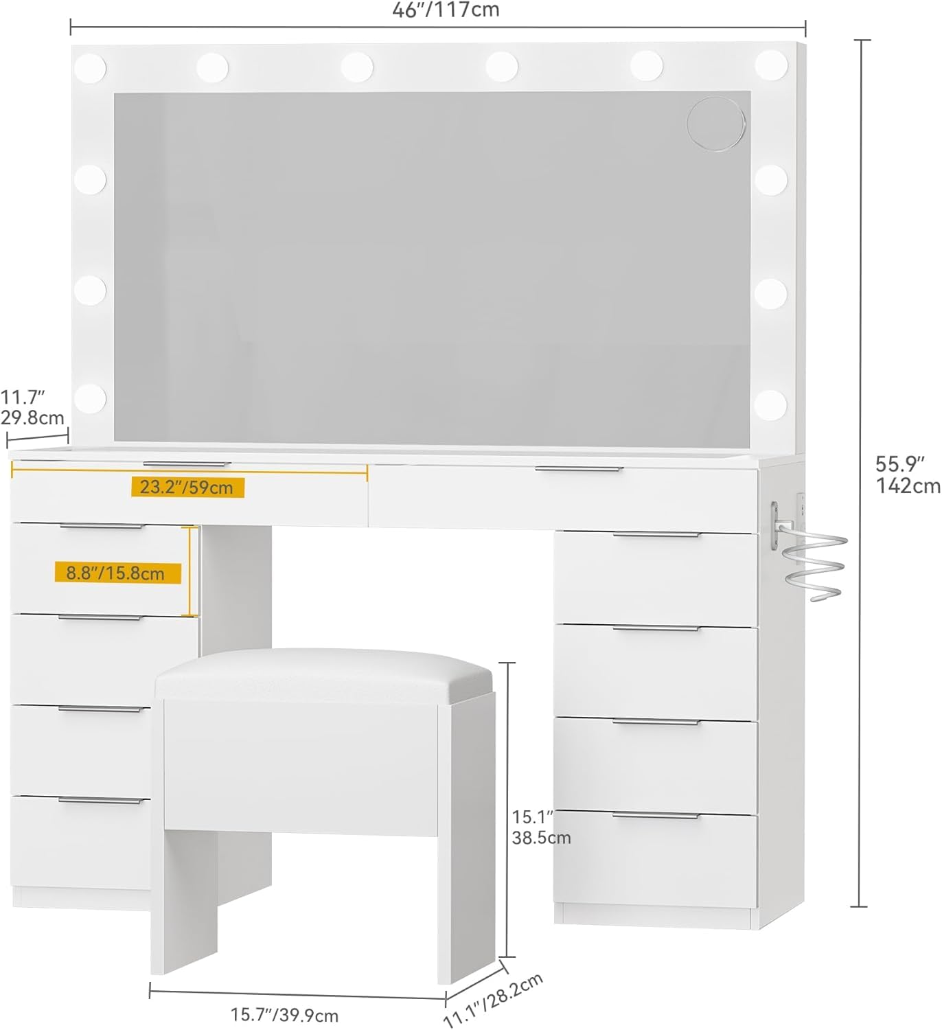 DWVO 46'' Glass Top Makeup Vanity with 10 Drawers, Vanity Desk Set with Large LED Mirror, Built-in Charging Station & Cushioned Storage Chair, Dressing Table with 3-Color Light Modes, Cream White