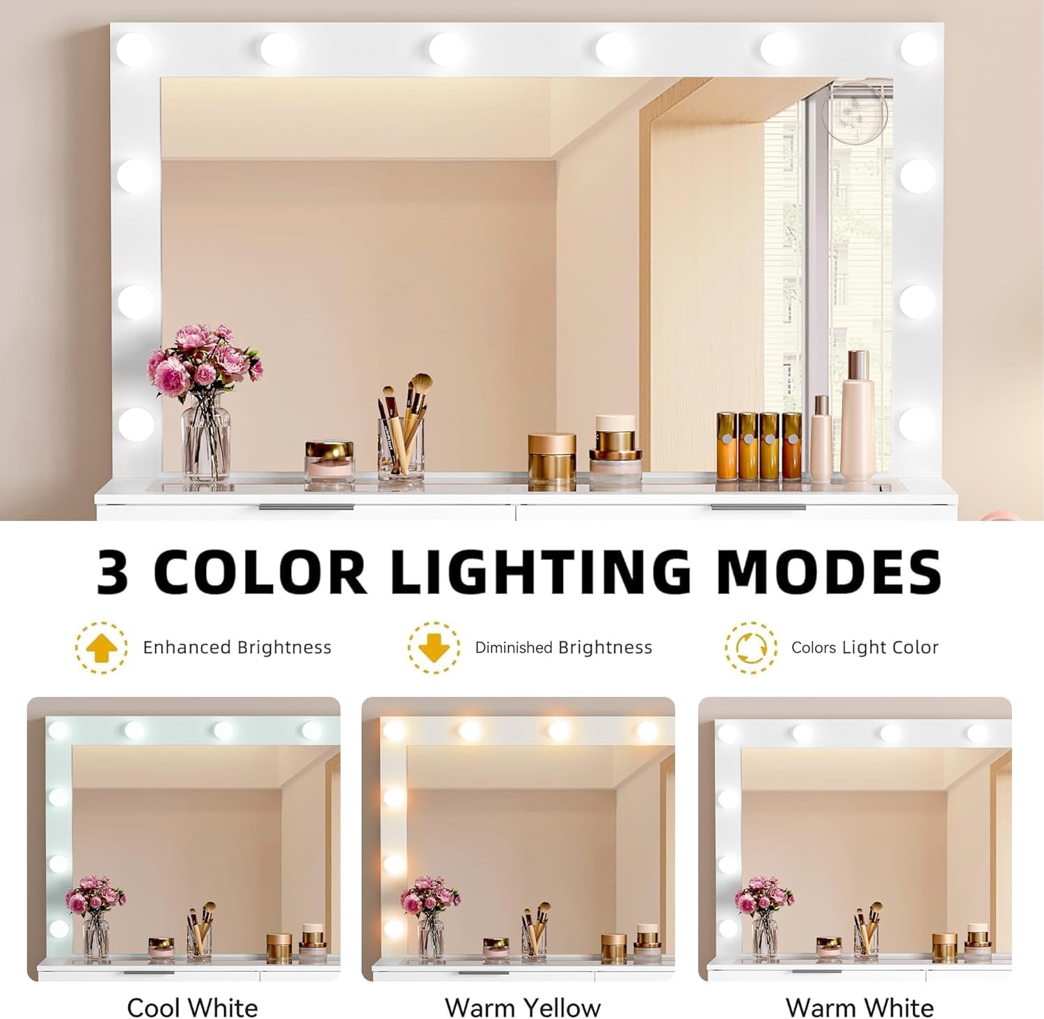 Details: Elevate your beauty space with this luxurious vanity set featuring a glass tabletop, spacious 10-drawer storage, and a grand mirror framed by 12 dimmable LED bulbs in 3 color modes. An integrated power hub keeps your tools and devices ready, while the cushioned vanity chair adds comfort and hidden storage. Designed for both elegance and function, it's ideal for makeup, styling, or professional use.
