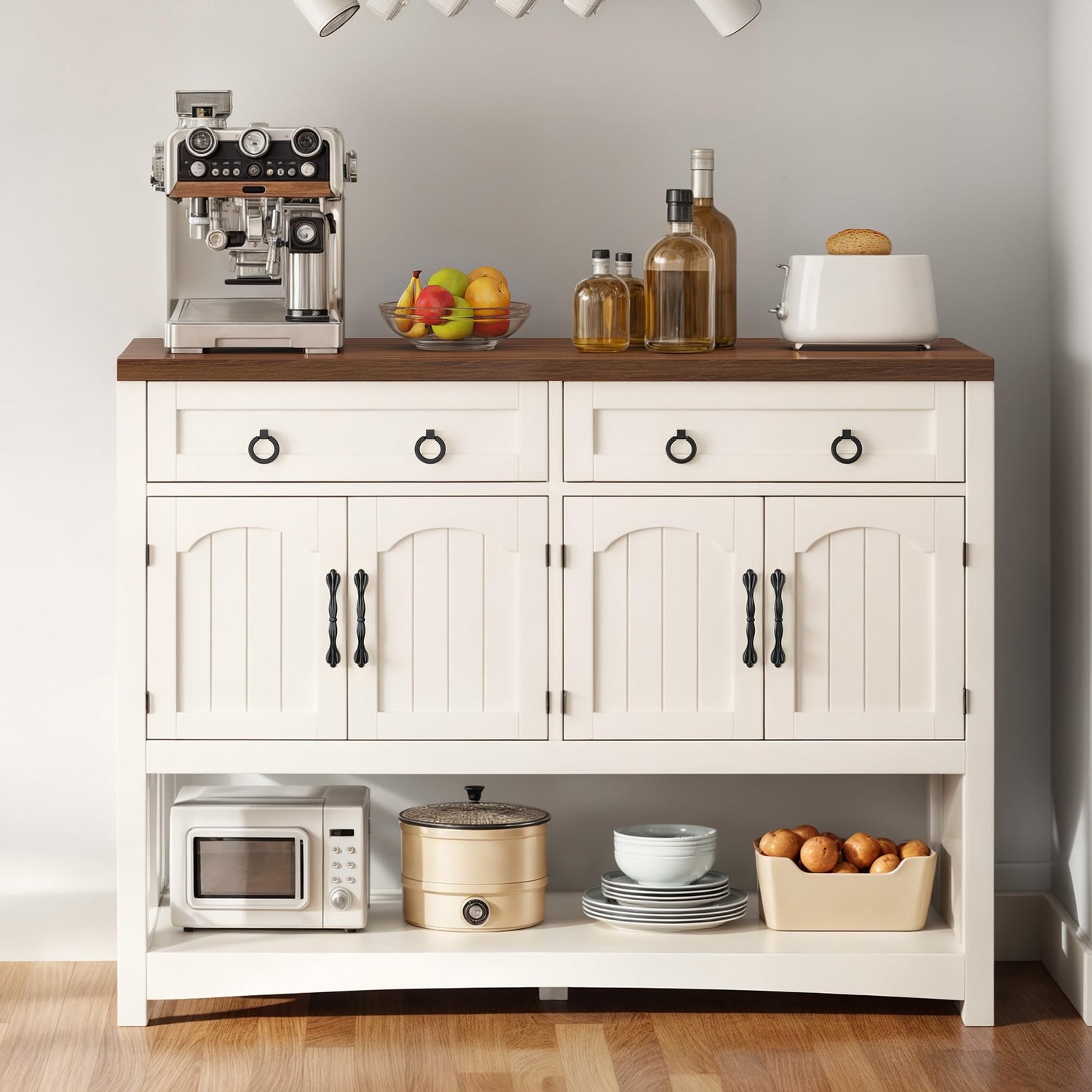 DWVO 47.2" Buffet Sideboard Cabinet with Storage, Farmhouse Coffee Bar Cabinet w/2 Drawers, Wood 4-Doors Console Table with Adjustable Shelves for Kitchen, Dining Room, Living Room, Entryway (White)