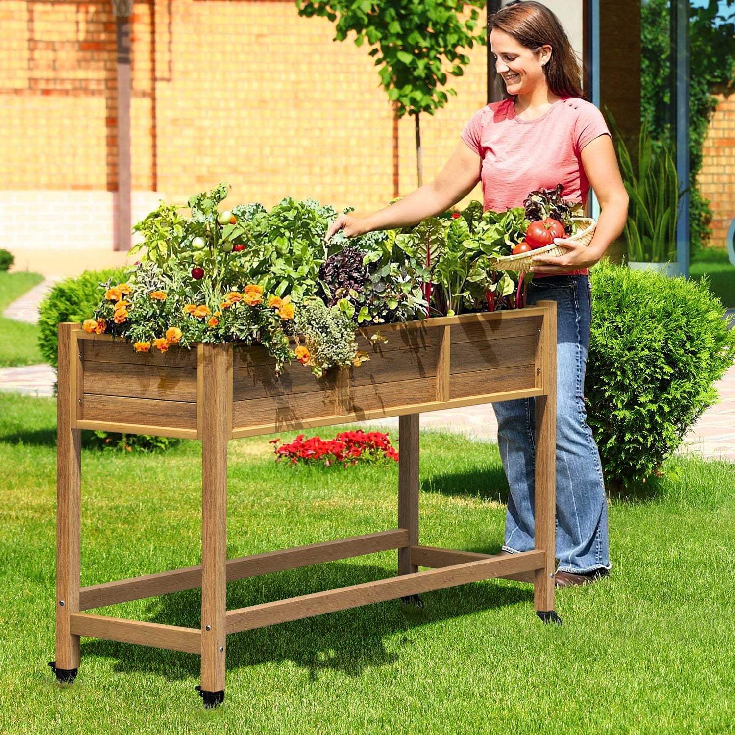 DWVO 47x18x31in Raised Garden Bed, Weather Resistant Poly Wood Planter Box Stand, Planter Box with Legs & Lockable Wheels, Elevated Garden Bed for Backyard Patio Balcony - Brown
