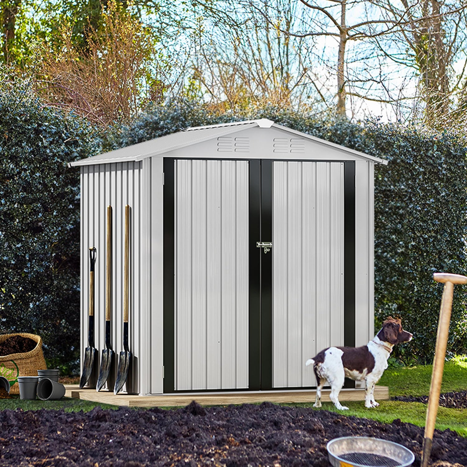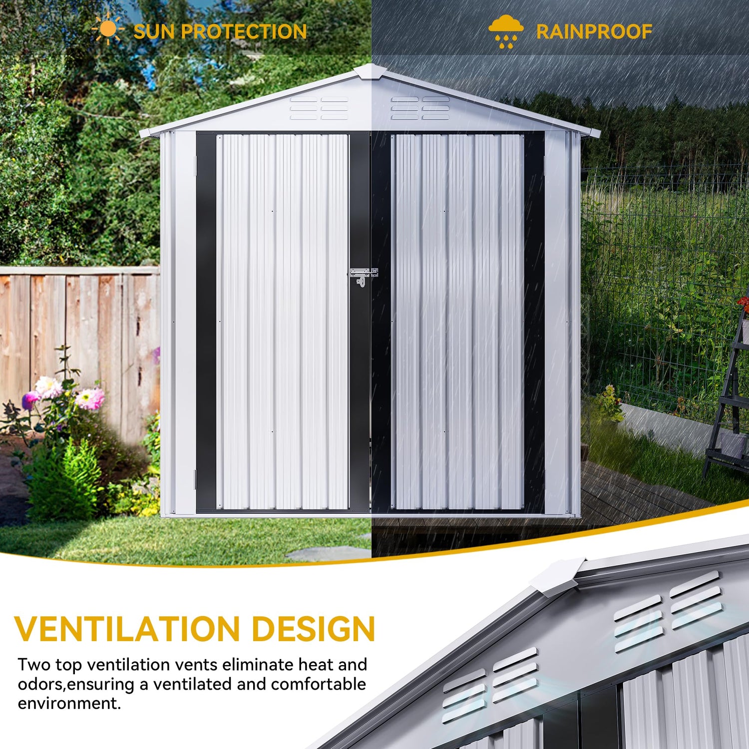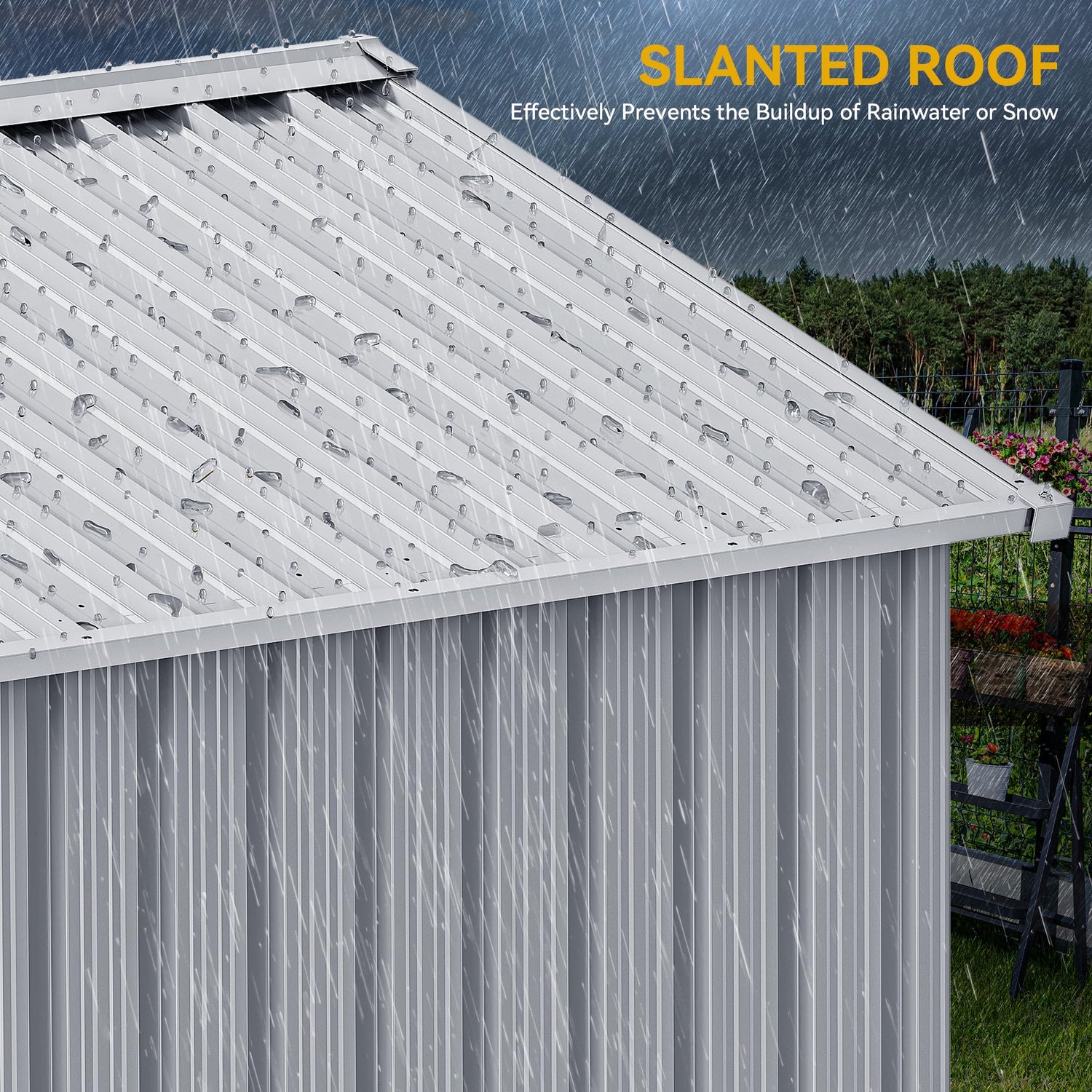 - ALL-WEATHER PRACTICALITY- Thickened galvanized steel and a durable frame harmonize to offer this outdoor storage shed great rust protection; Overlapping wall panels work with tilted roof to prevent rainwater from gathering or seeping in for year-round use.