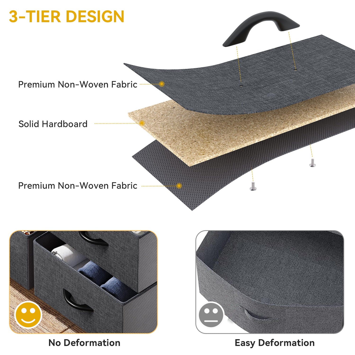 - UNIVERSAL MATCH- Premium black grey fabric drawers, sturdy white metal frame and waterproof wooden tabletop give the storage organizer a modern style. This unit easily fits in various living spaces: living rooms, bedrooms, hallways, entryways, closets and nurseries, etc.