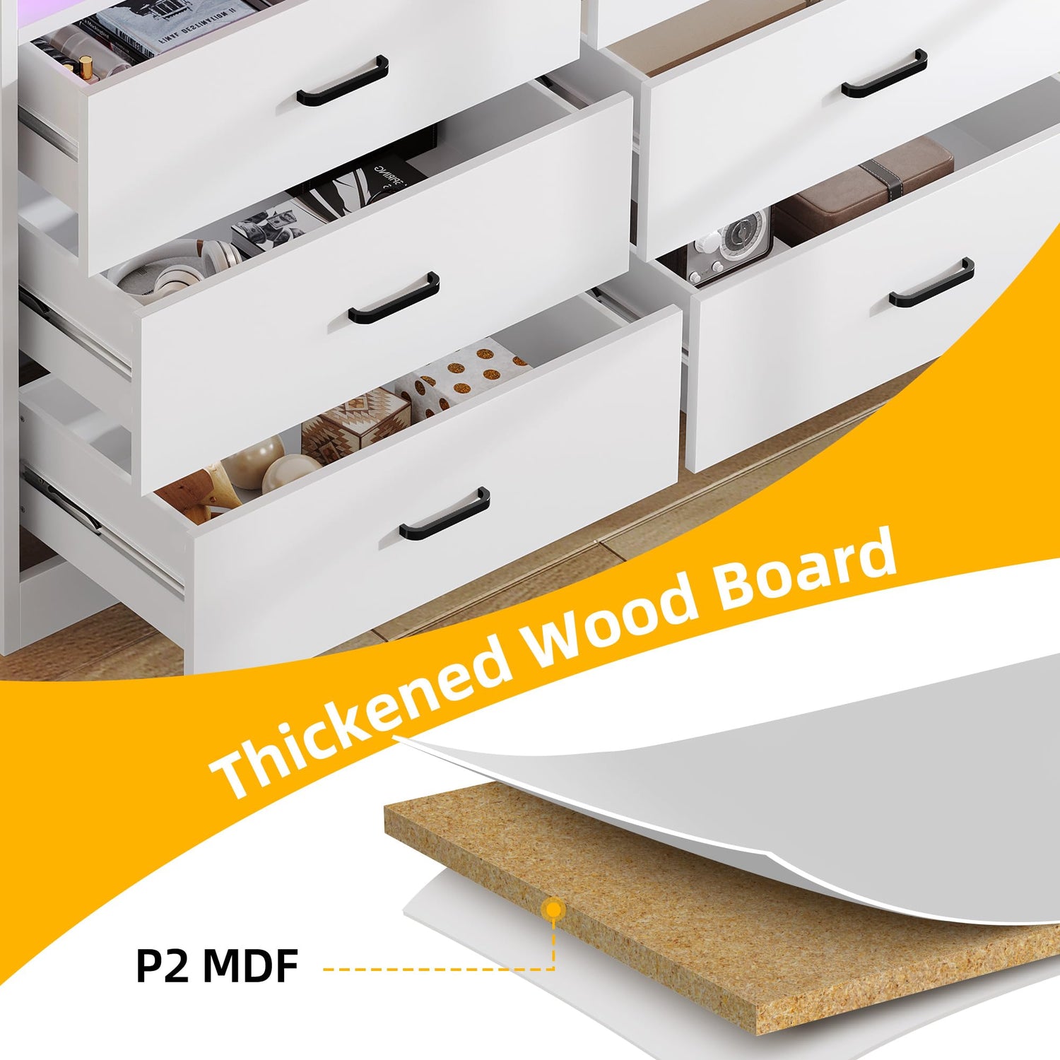 DWVO 6 Drawer Dresser with LED Light and Charging Station, Modern Chest of Drawers, Wide Drawer Organizer Cabinet for Living Room, Entryway, Hallway