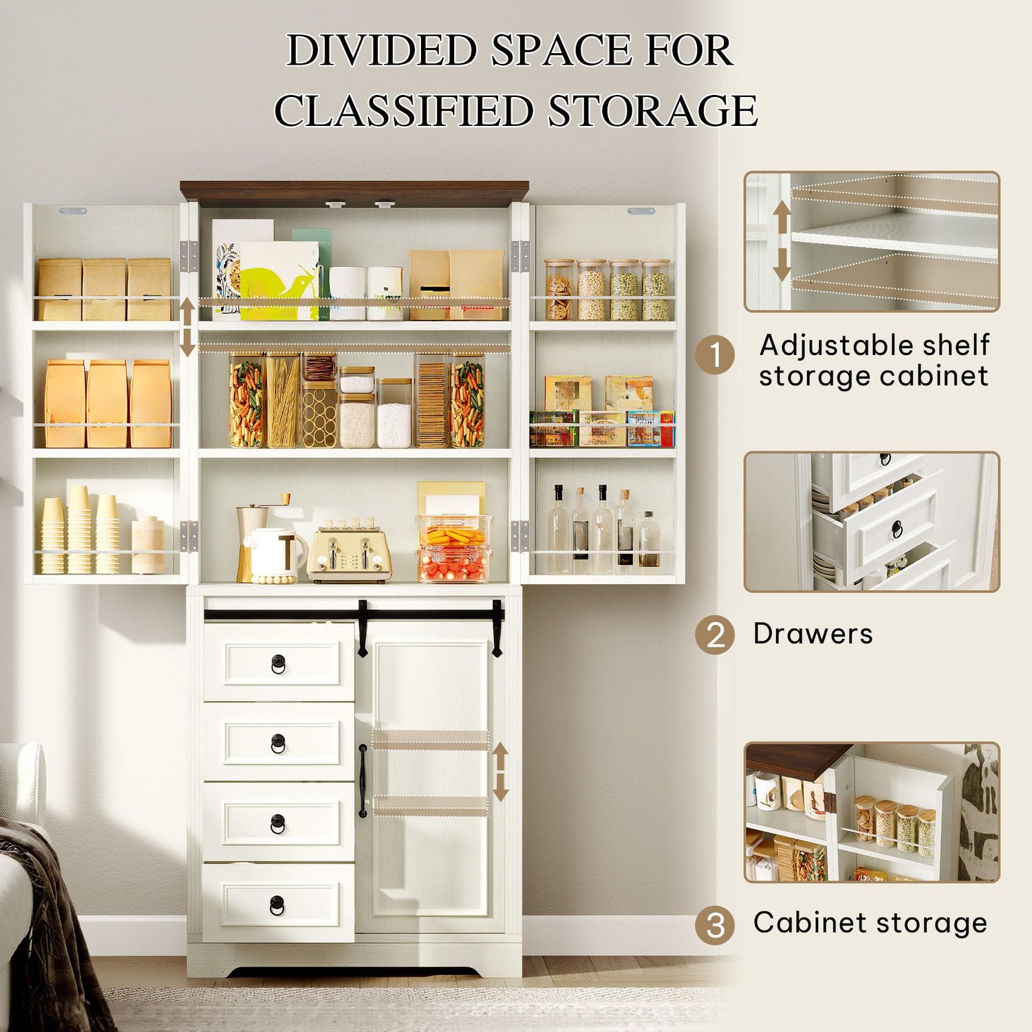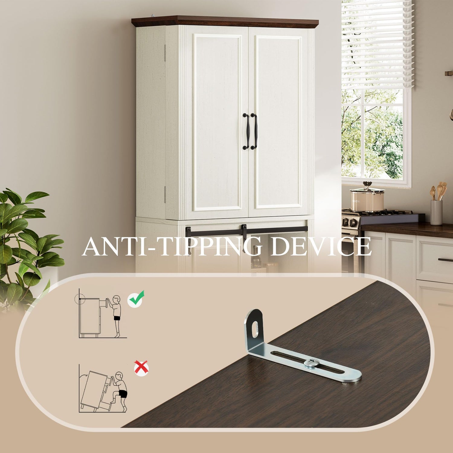 - Built to Last and Safe: Crafted from durable engineered wood, this food pantry cabinet with drawer is designed for years of use. Plus, it includes a tip-proof kit, keeping it safely secured to the wall to prevent any accidents, making it safe for homes with playful pets